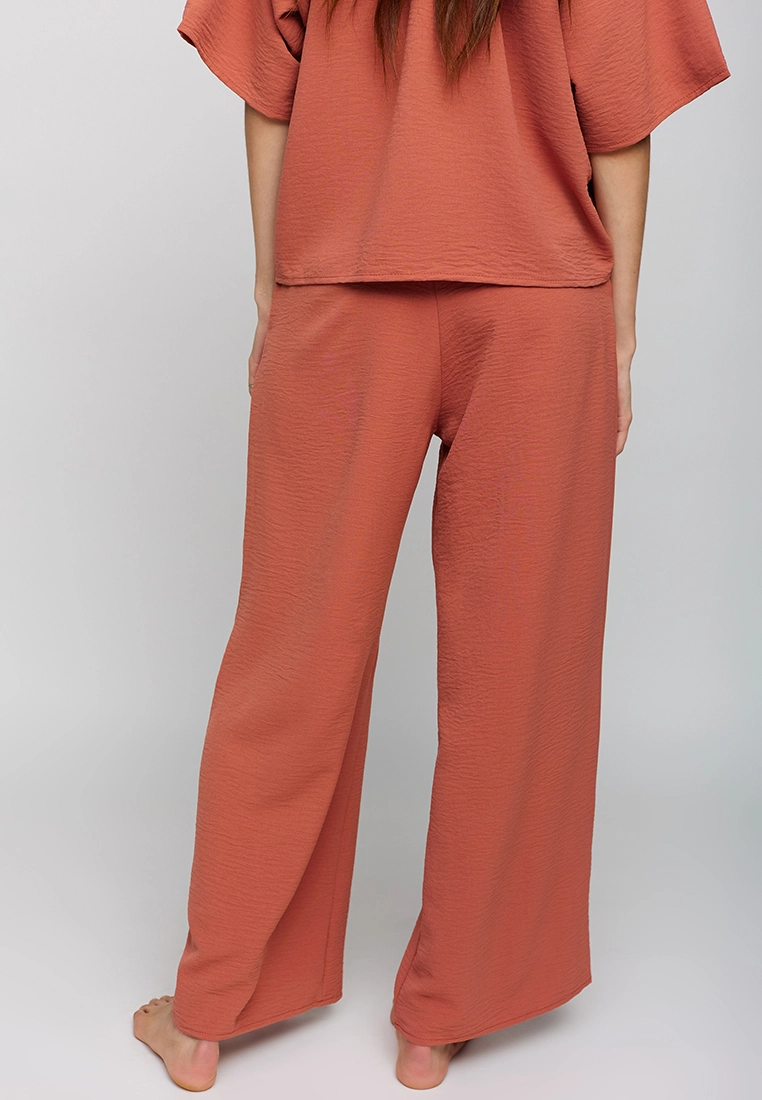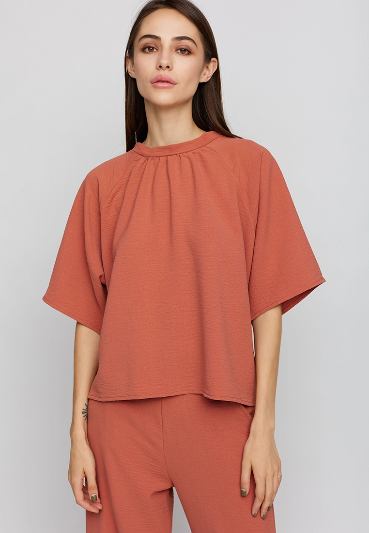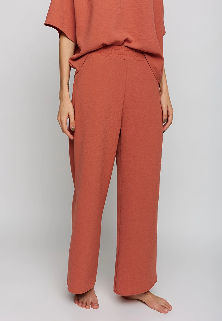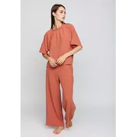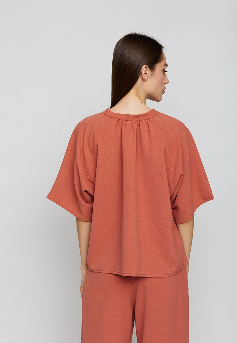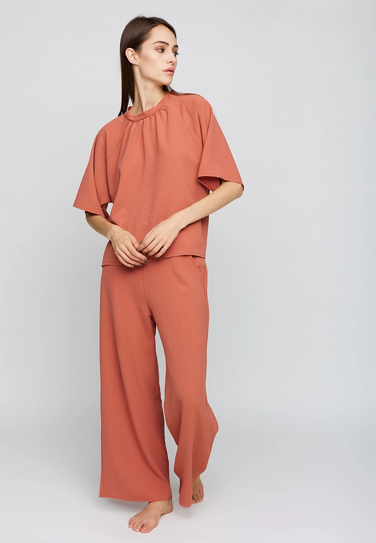 Костюм футболка oversize плюс брюки-кюлоты из из легкой ткани с эффектом жатки. Футболка широкая, рукав-реглан, по горловине сборка; кюлоты с высокой посадкой, пояс на резинке, карманы в боковых швах