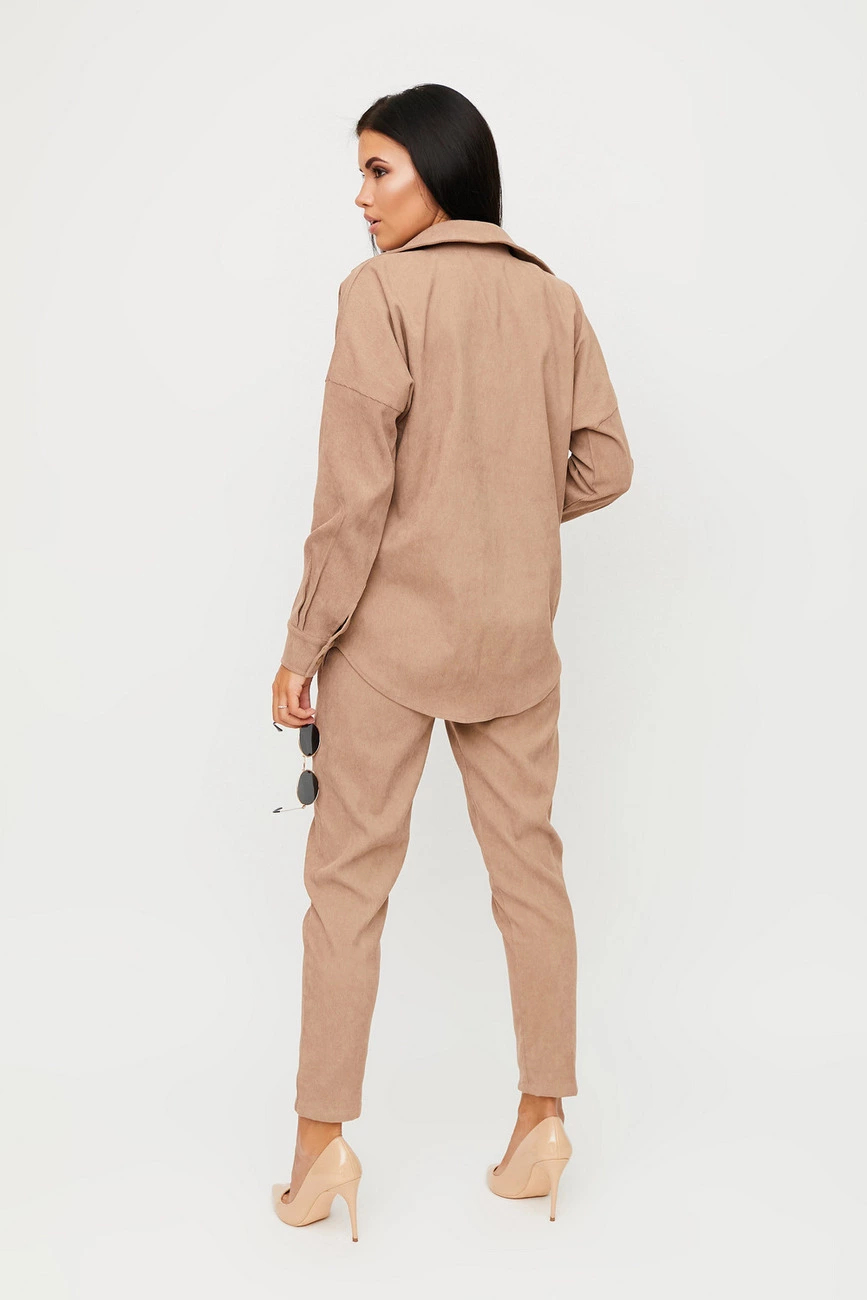Костюм рубашка плюс брюки из вельвета. Рубашка свободного кроя с длинными рукавами, спущенная линия плеча, небольшой воротник, на рукавах и по низу изделия манжеты; застежка: кнопки. Брюки со средней посадкой кроя "бананы"; длина 7/8; карманы впереди, талия на резинке