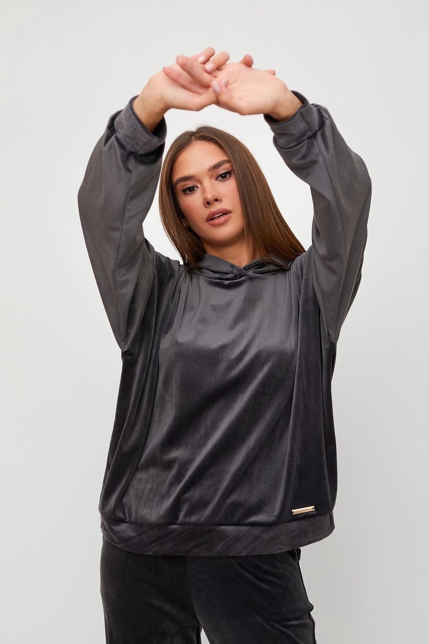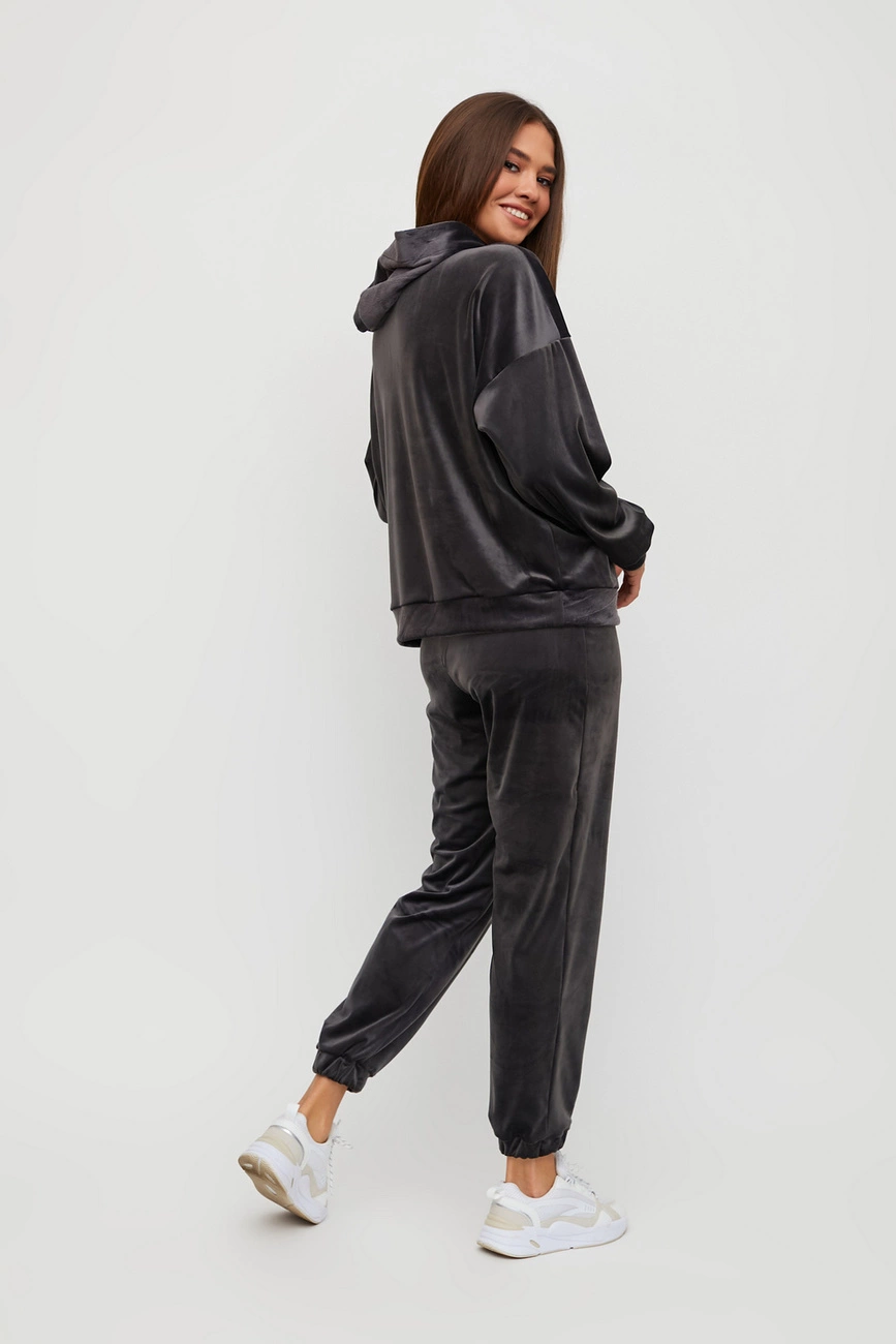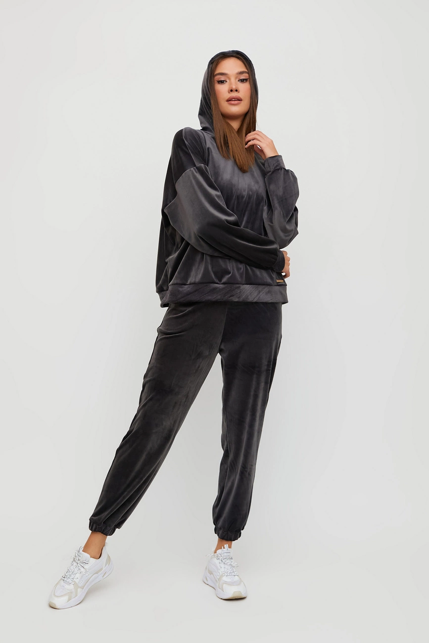 Костюм свитшот oversize плюс брюки из тянущегося ворсистого трикотажа. Свитшот свободного кроя со спущенной линией плеча, есть капюшон; штаны прямого кроя с высокой посадкой, манжеты на резинке, в боковых швах карманы