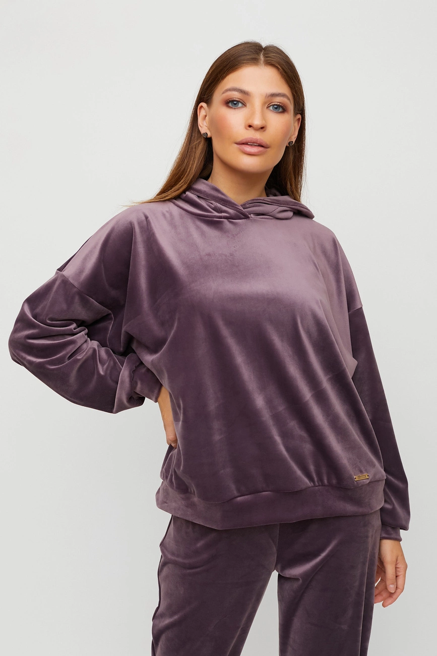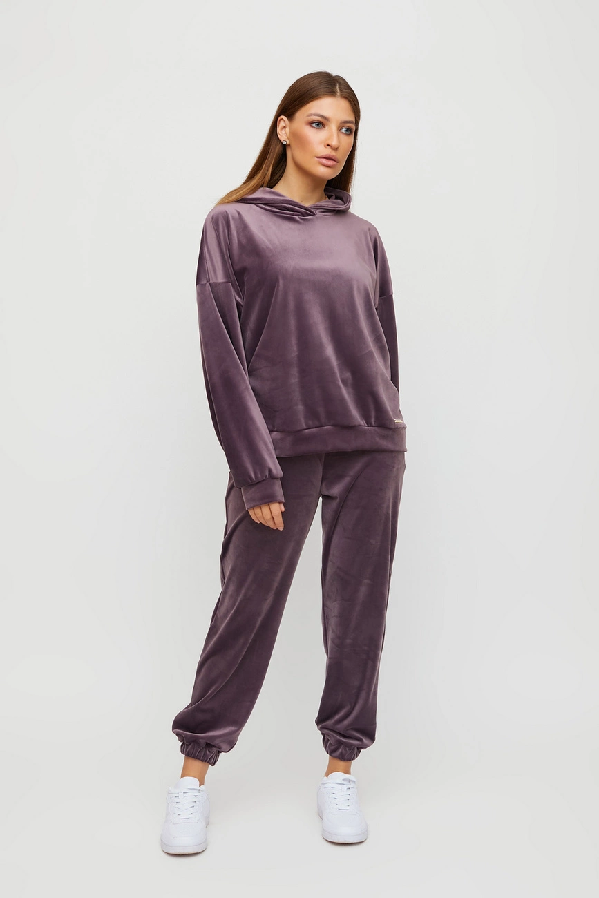 Костюм свитшот oversize плюс брюки из тянущегося ворсистого трикотажа. Свитшот свободного кроя со спущенной линией плеча, есть капюшон; штаны прямого кроя с высокой посадкой, манжеты на резинке, в боковых швах карманы