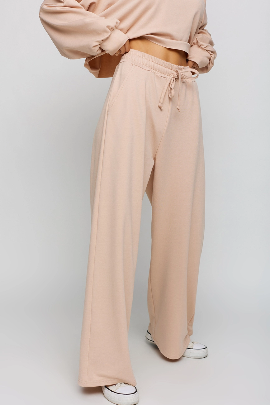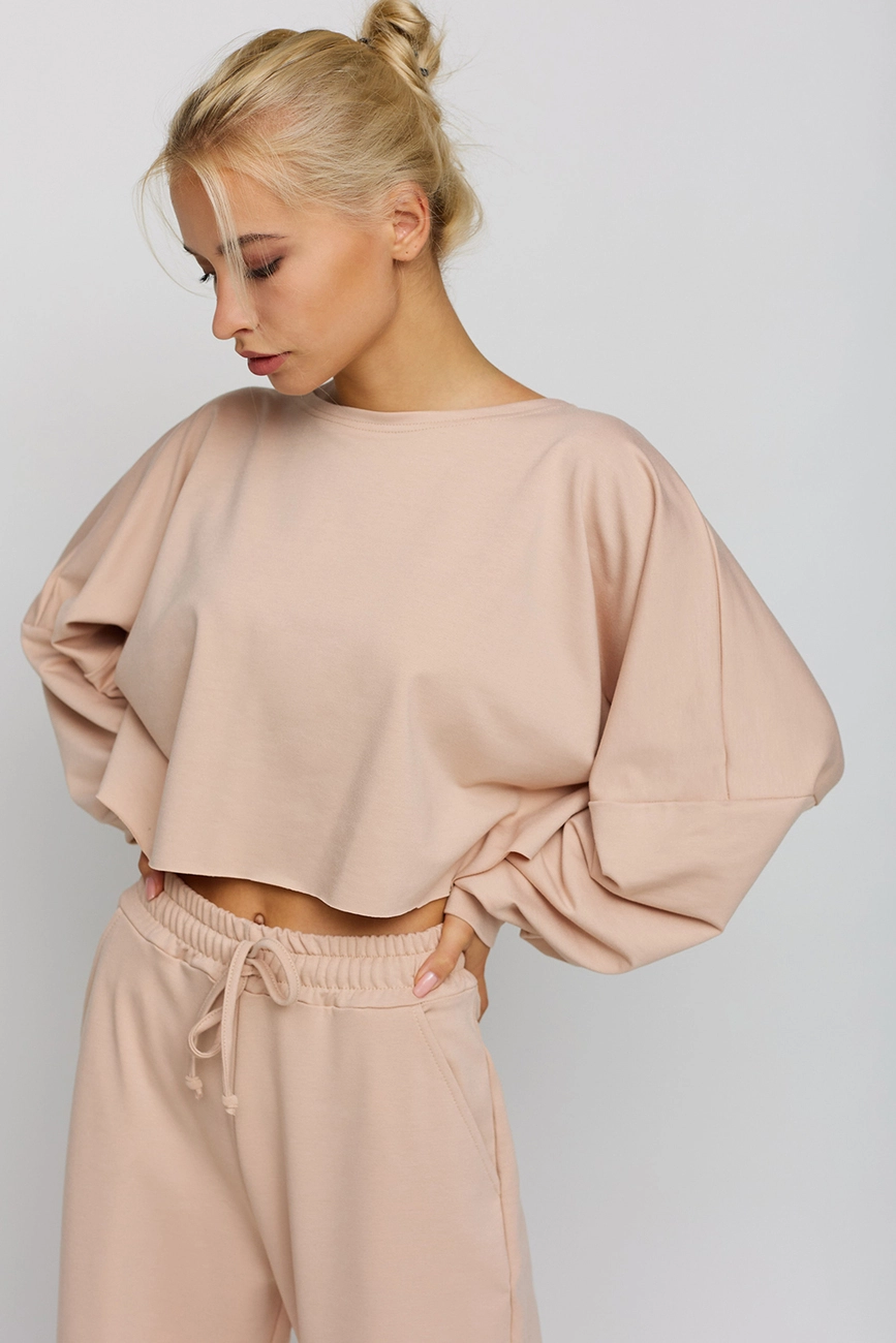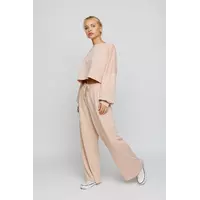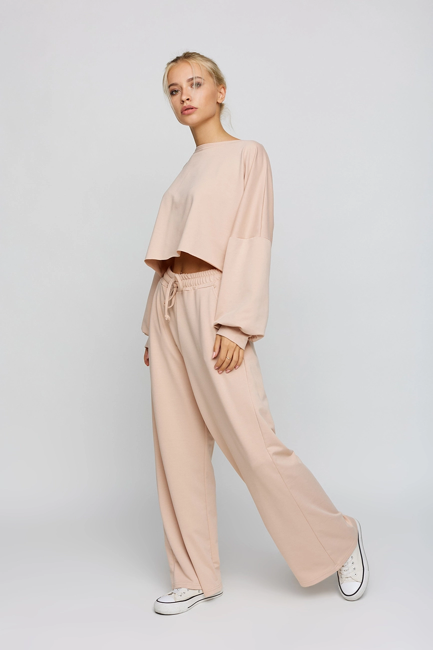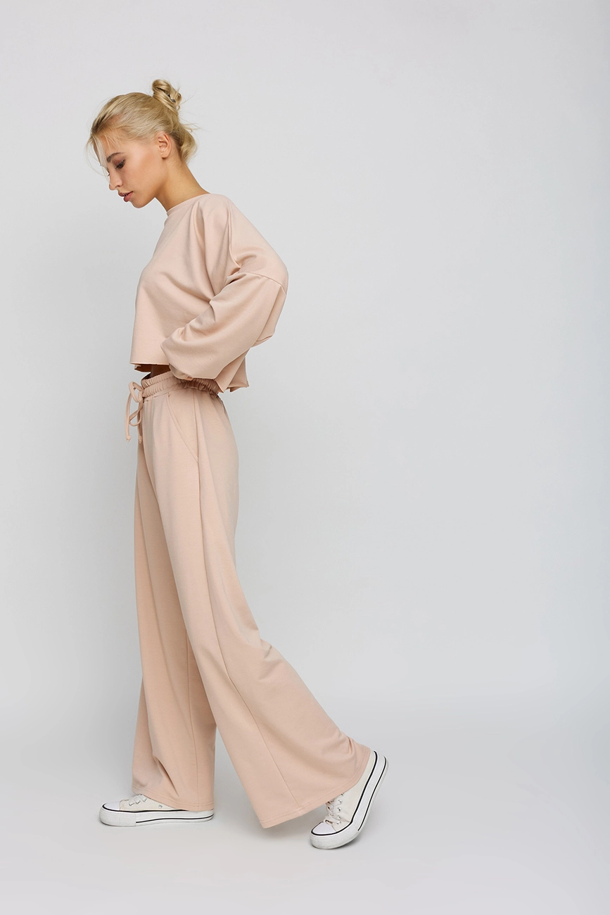 Костюм свитшот oversize плюс брюки-кюлоты из легкого трикотажа. Свитшот укороченной длины с необработанным краем, спущенная линия плеча, на рукавах манжеты; кюлоты с высокой посадкой, пояс на резинке, карманы в боковых швах