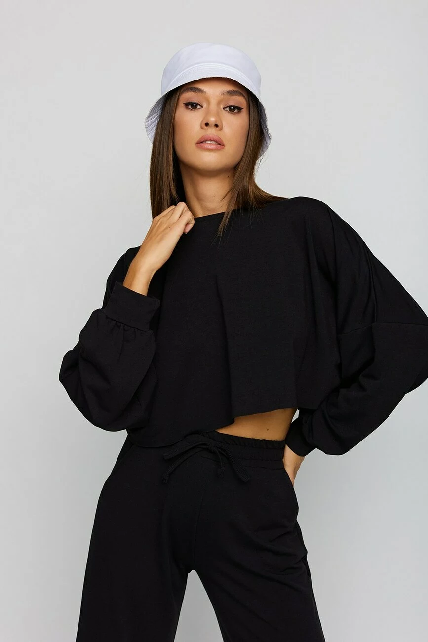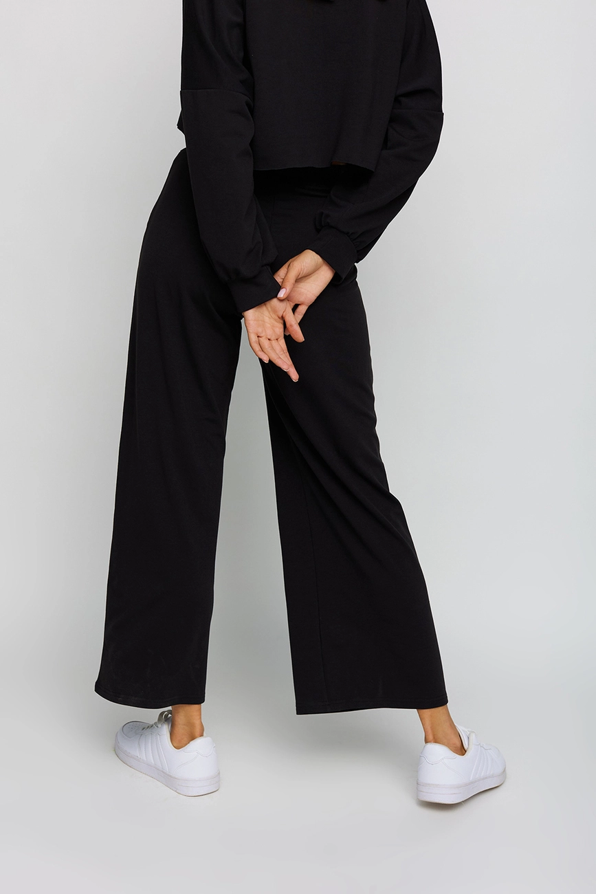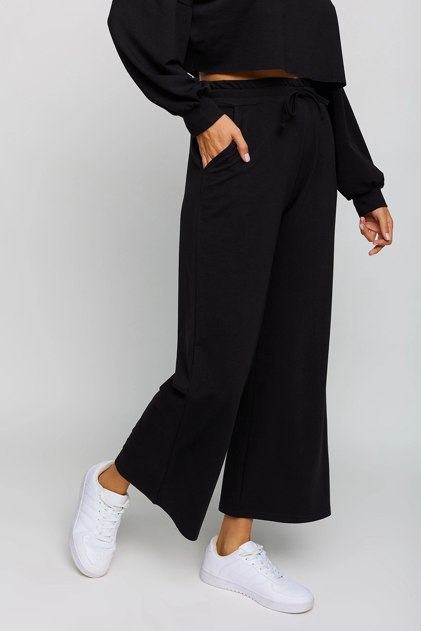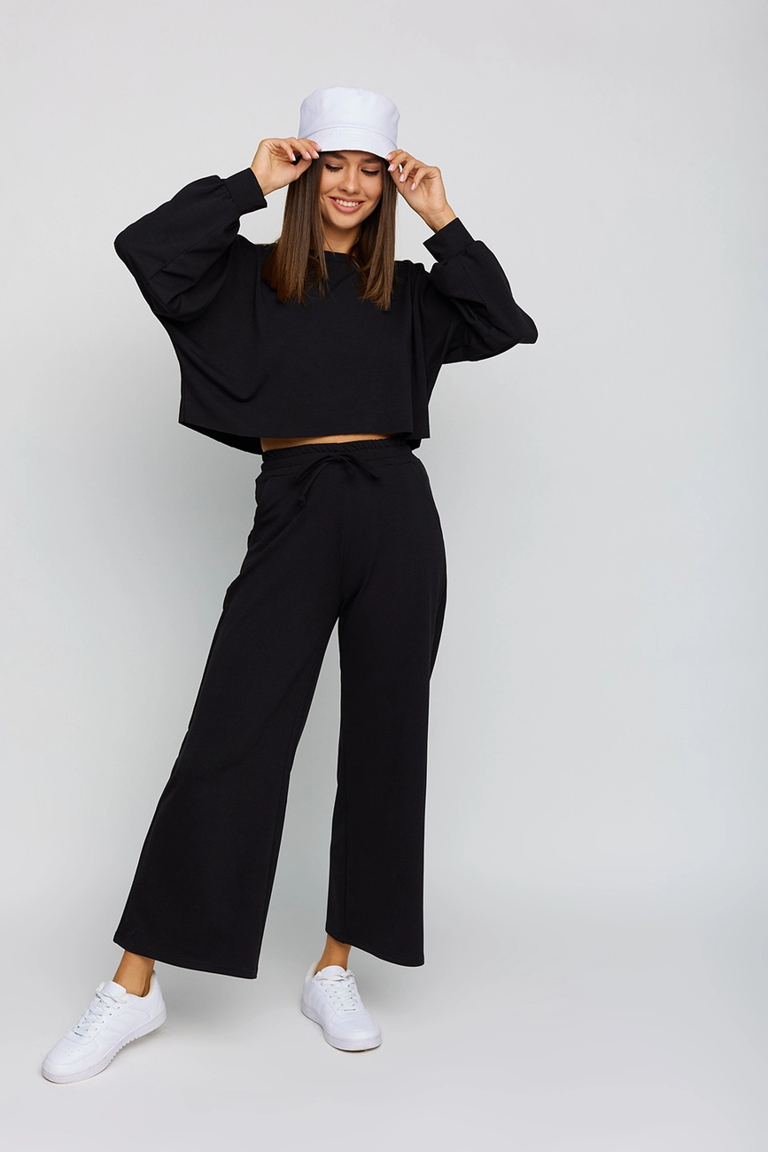 Костюм свитшот oversize плюс брюки-кюлоты из легкого трикотажа. Свитшот укороченной длины с необработанным краем, спущенная линия плеча, на рукавах манжеты; кюлоты с высокой посадкой, пояс на резинке, карманы в боковых швах