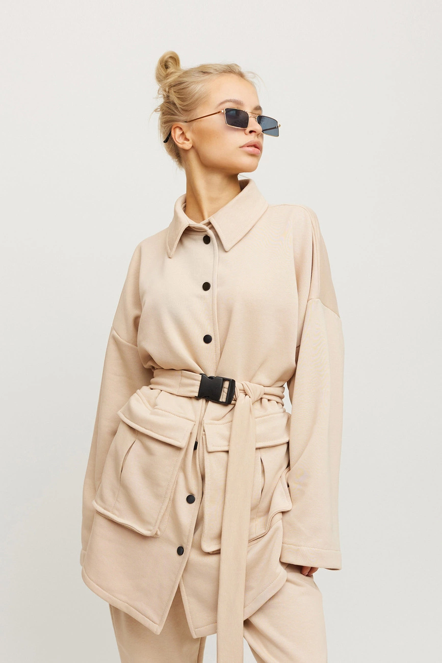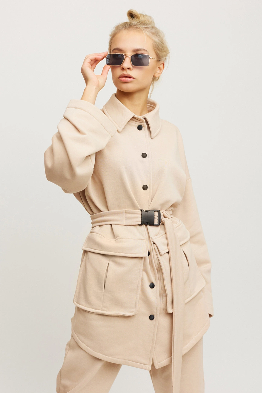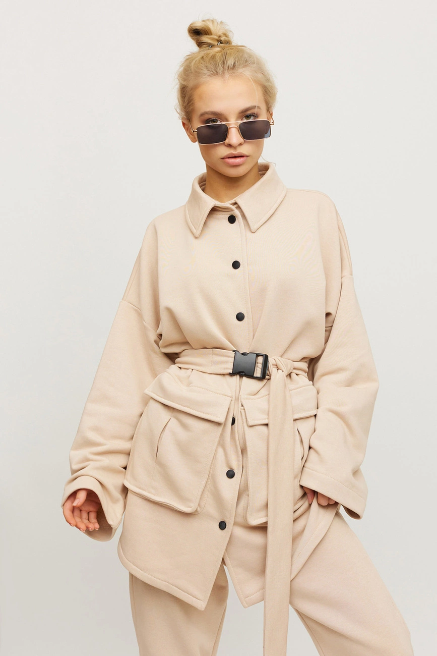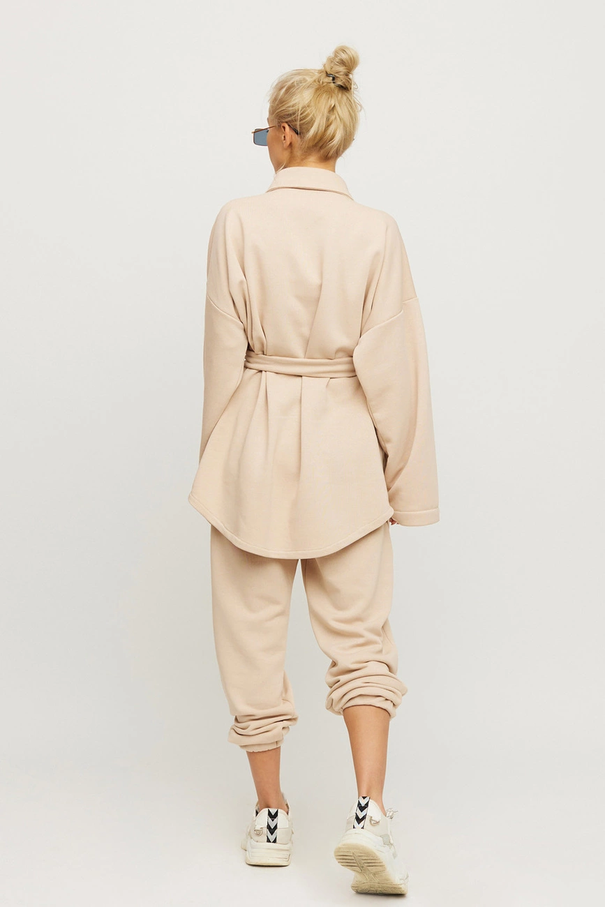 Костюм кофта и штаны из трехнити с ппетлей: кофта oversize кроя на кнопках, накладные карманы, без манжета; брюки с манжетами, есть карманы; пояс с фастексом в комплекте