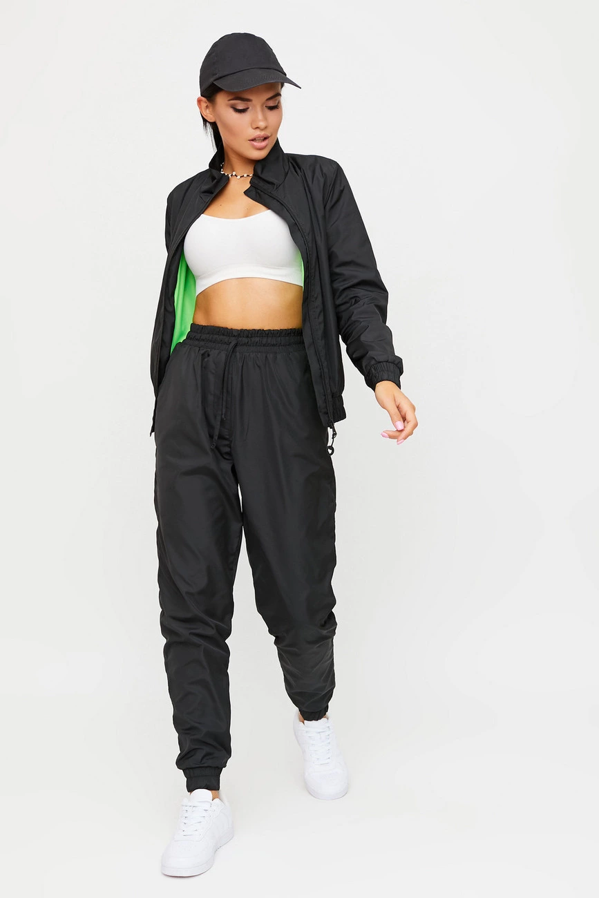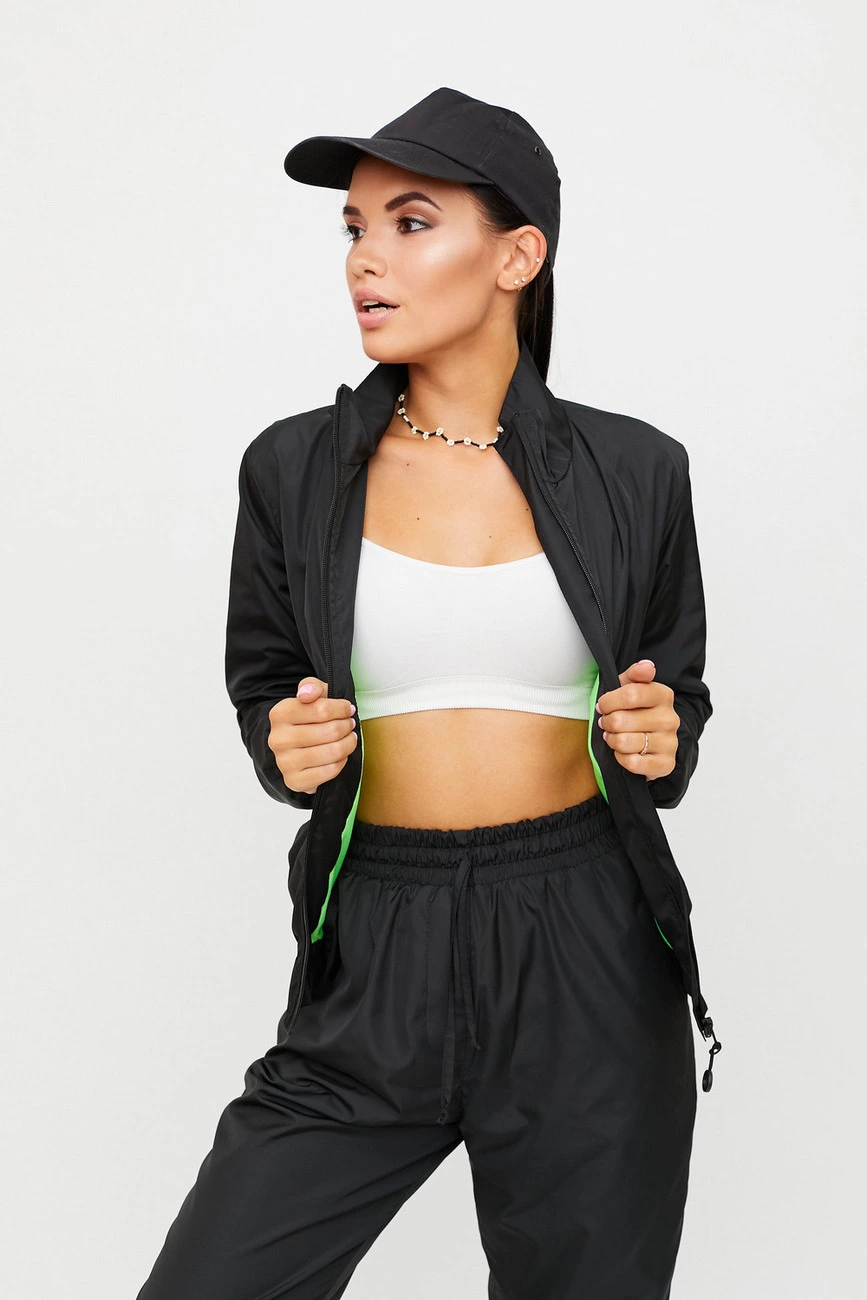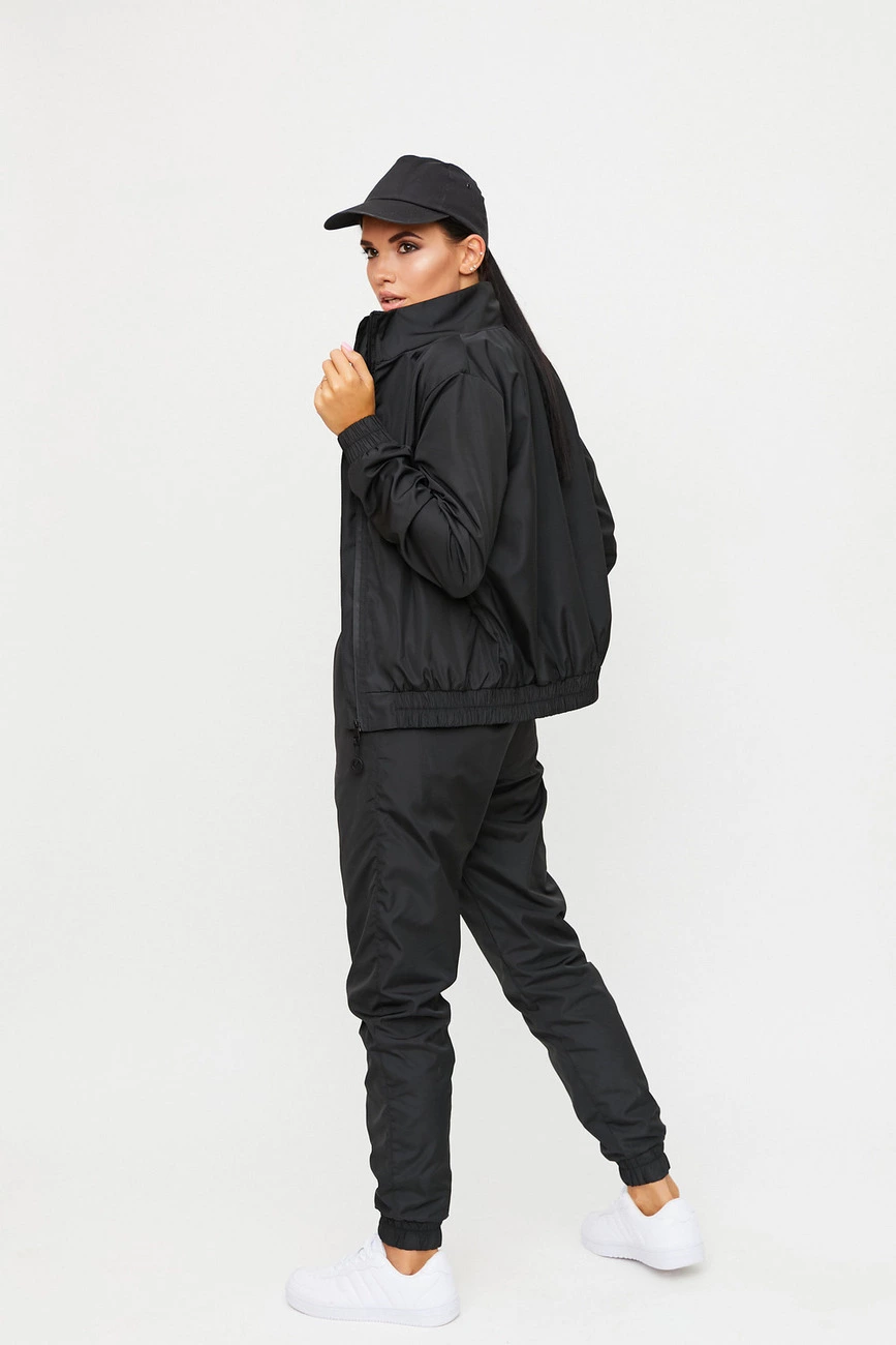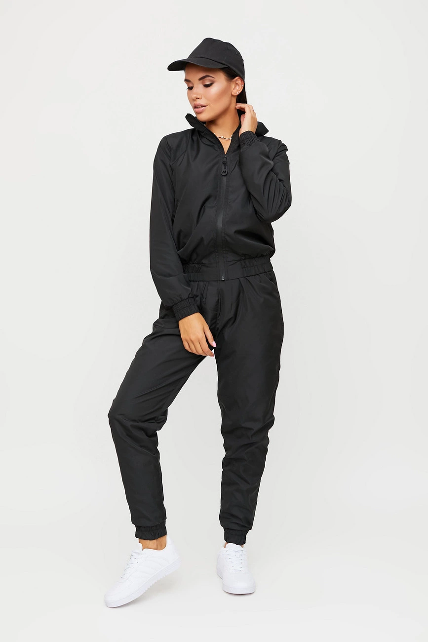 Костюм куртка плюс штаны из непромокаемой ткани на трикотажной подкладке. Куртка укороченного кроя с длинным рукавом, манжеты-резинки на рукавах и по низу изделия, застежка: молния. Штаны со средней посадкой, пояс и манжеты на резинке, есть карманы
