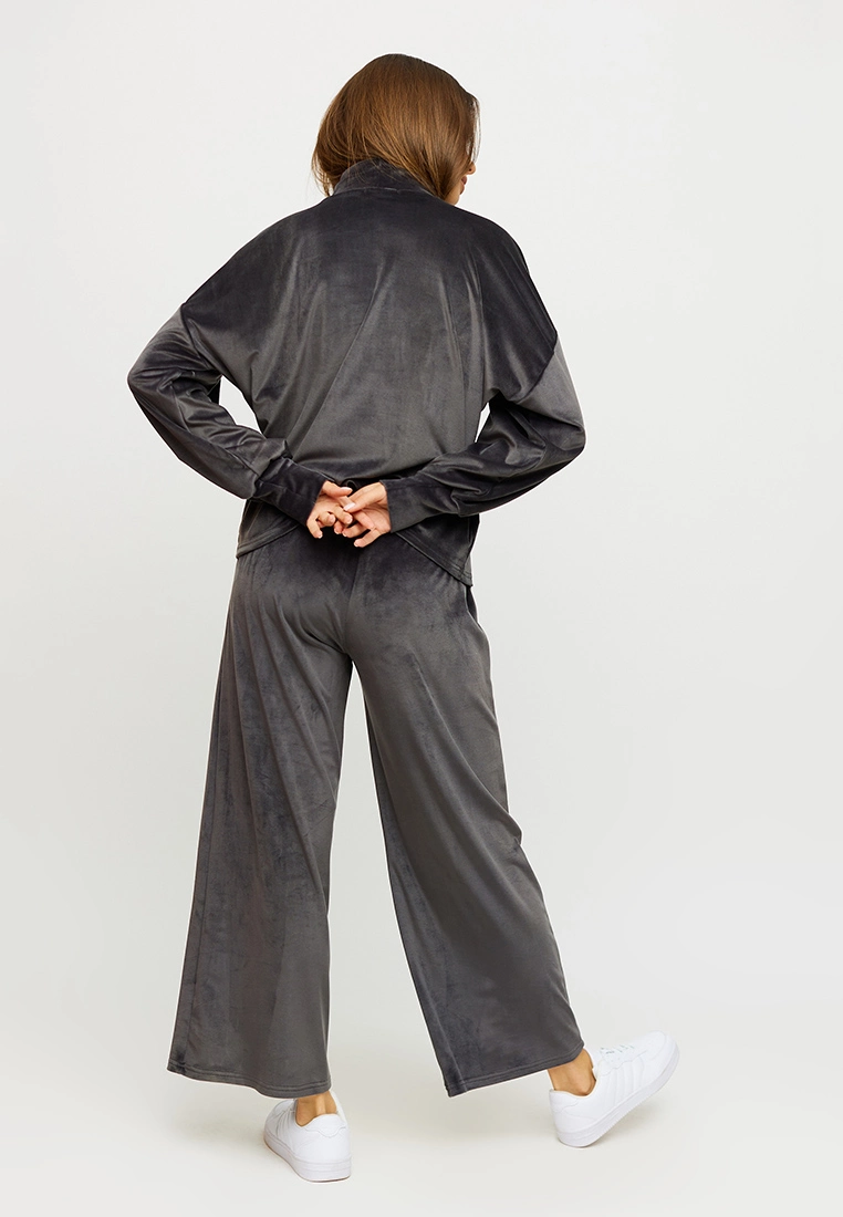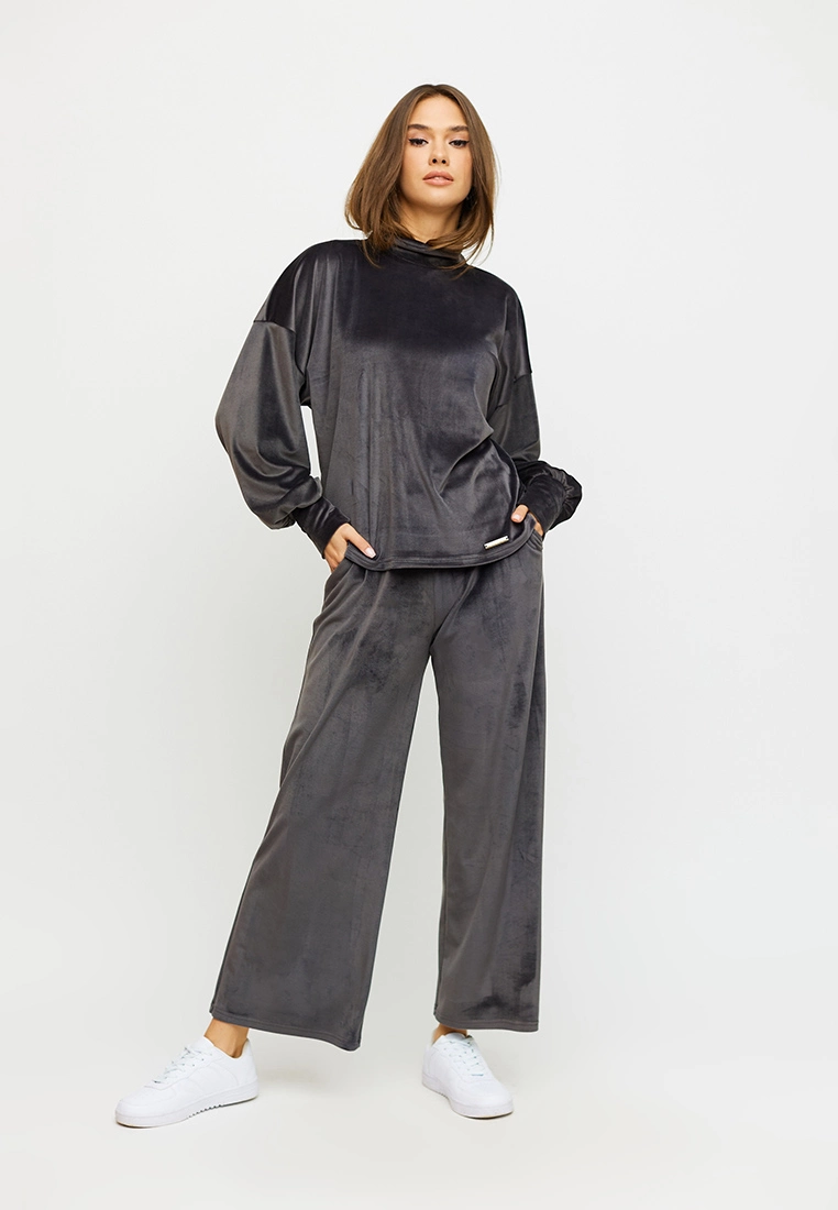 Костюм свитшот плюс брюки-кюлоты из мягкого ворсистого трикотажа. Свитшот свободного кроя, невысокий воротник-стойка, спущенная линия плеча, широкий рукав, собранный манжетом ; кюлоты с высокой посадкой, пояс на резинке, карманы в боковых швах