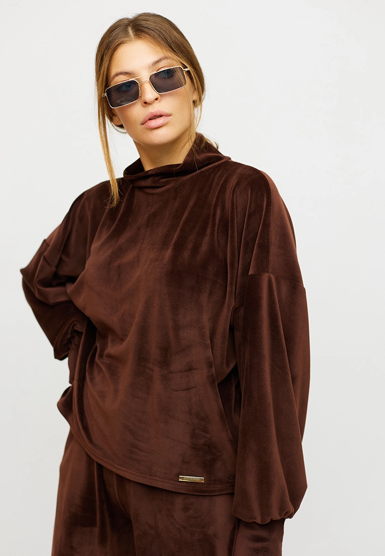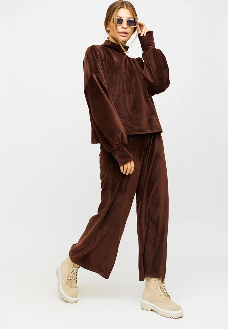 Костюм свитшот плюс брюки-кюлоты из мягкого ворсистого трикотажа. Свитшот свободного кроя, невысокий воротник-стойка, спущенная линия плеча, широкий рукав, собранный манжетом ; кюлоты с высокой посадкой, пояс на резинке, карманы в боковых швах