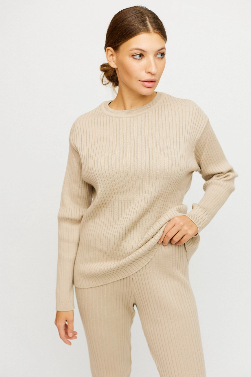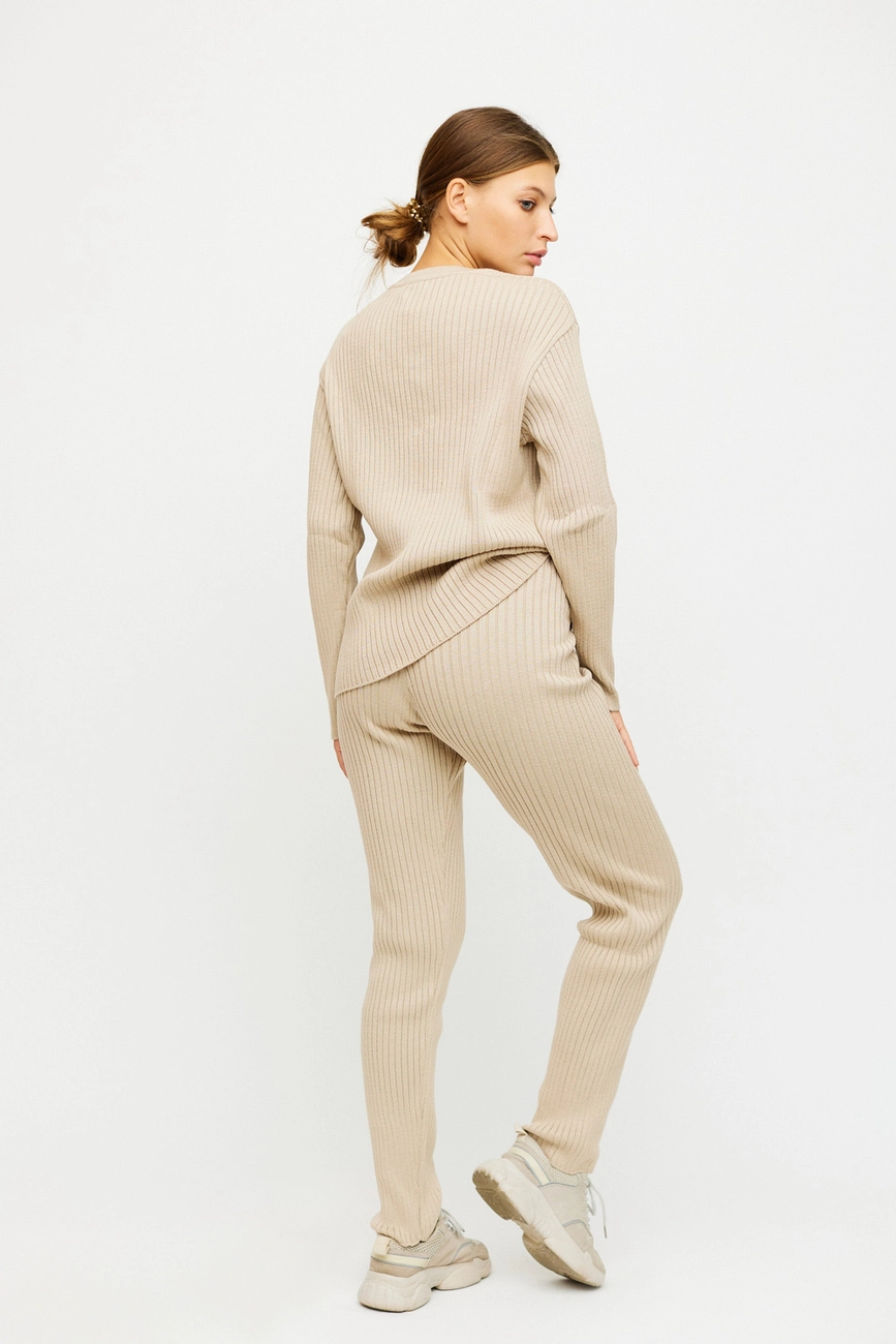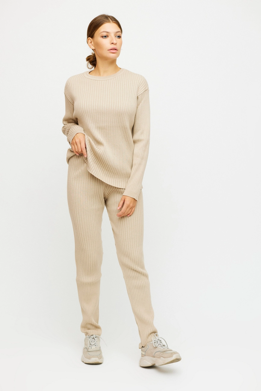 Костюм свитер плюс штаны из хлопкового вязанного трикотажа. Свитшот со спущенной линией плеча, свободный силуэт, длинный рукав; штаны прямого кроя, пояс на резинке