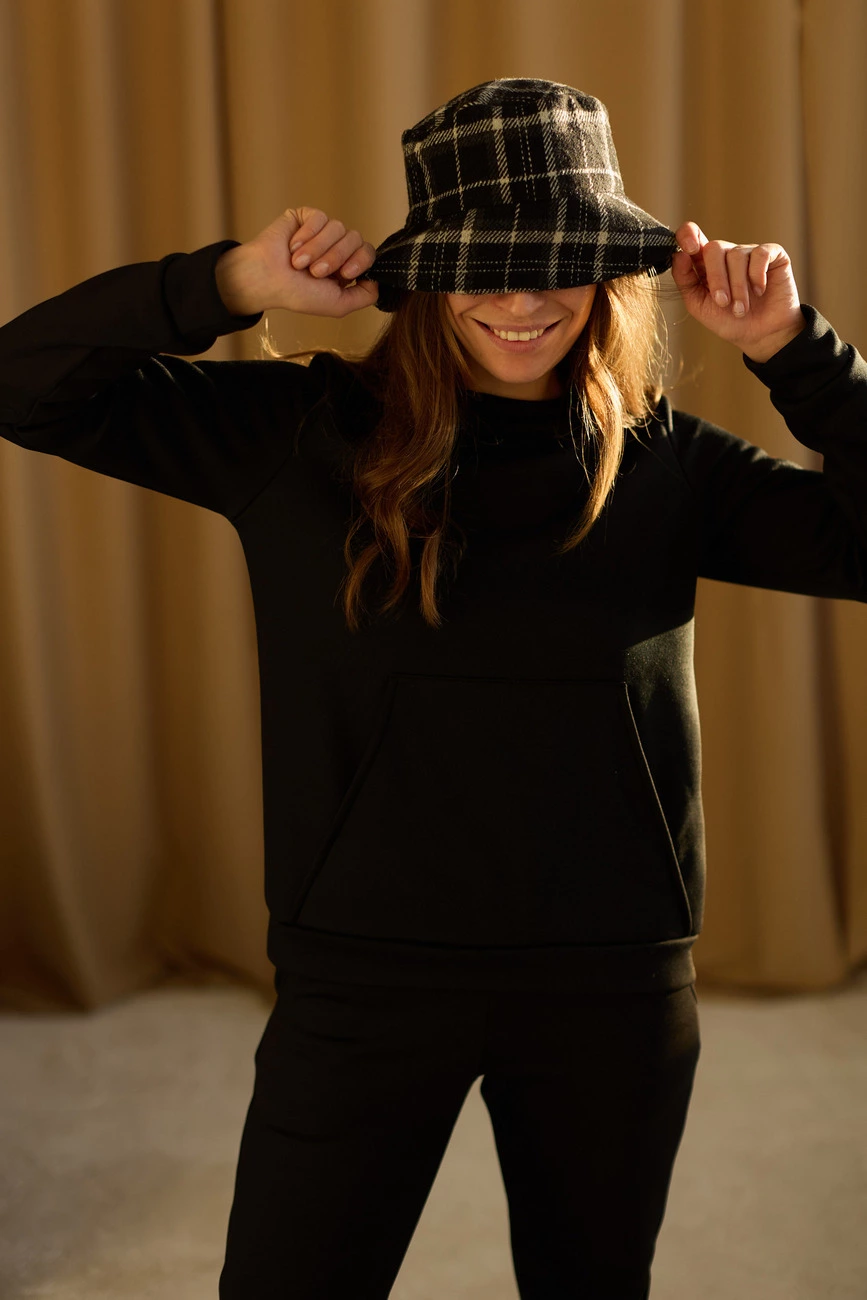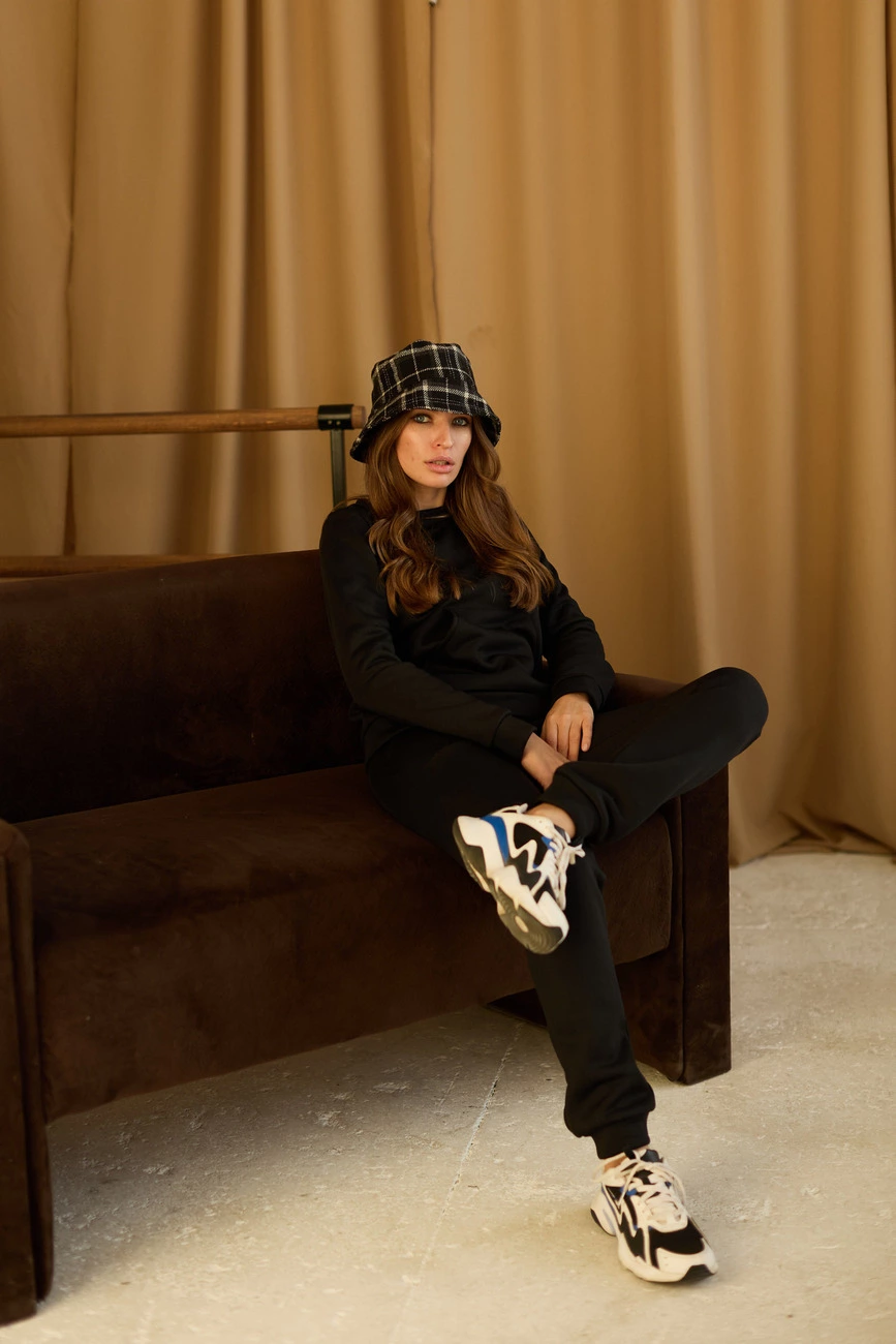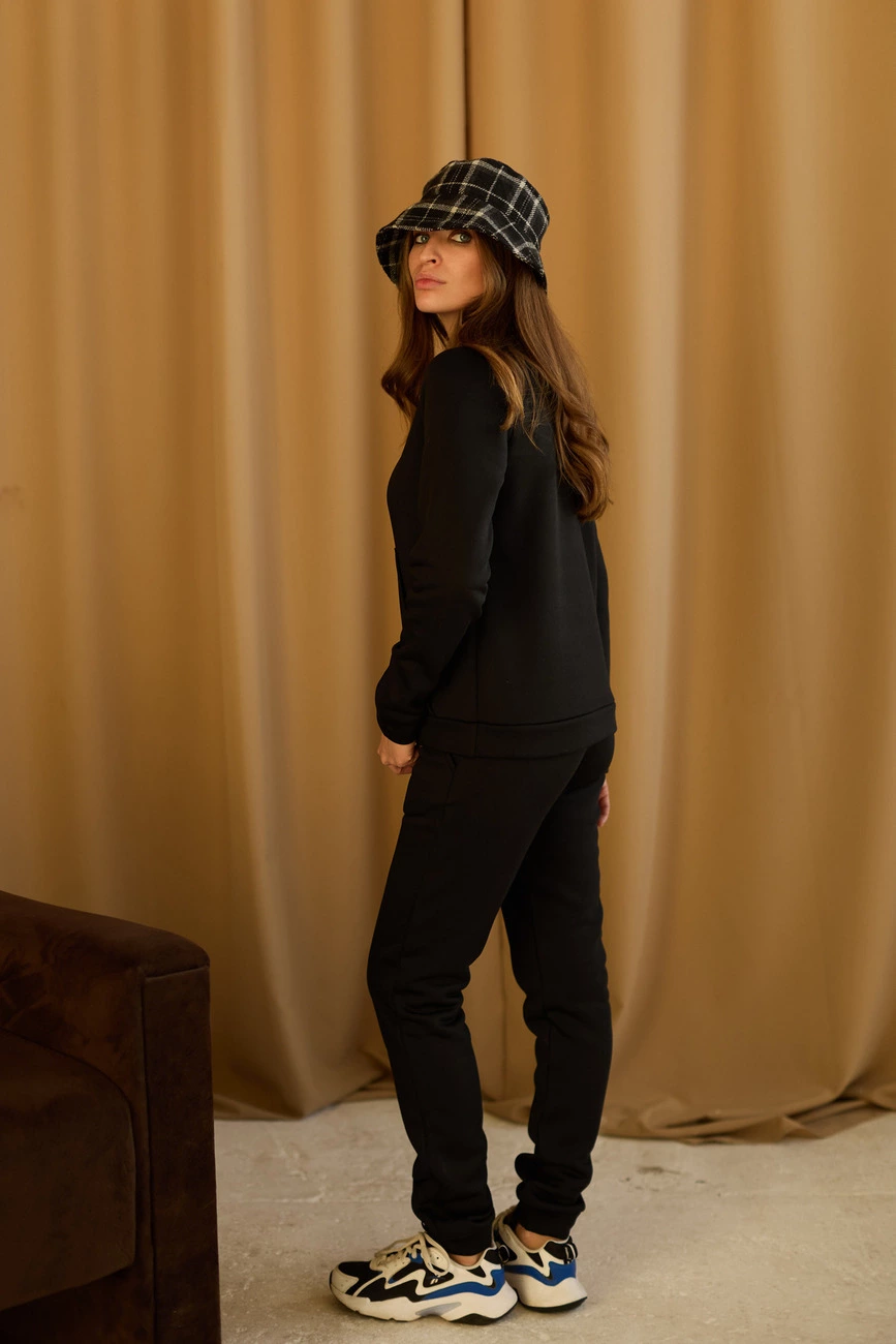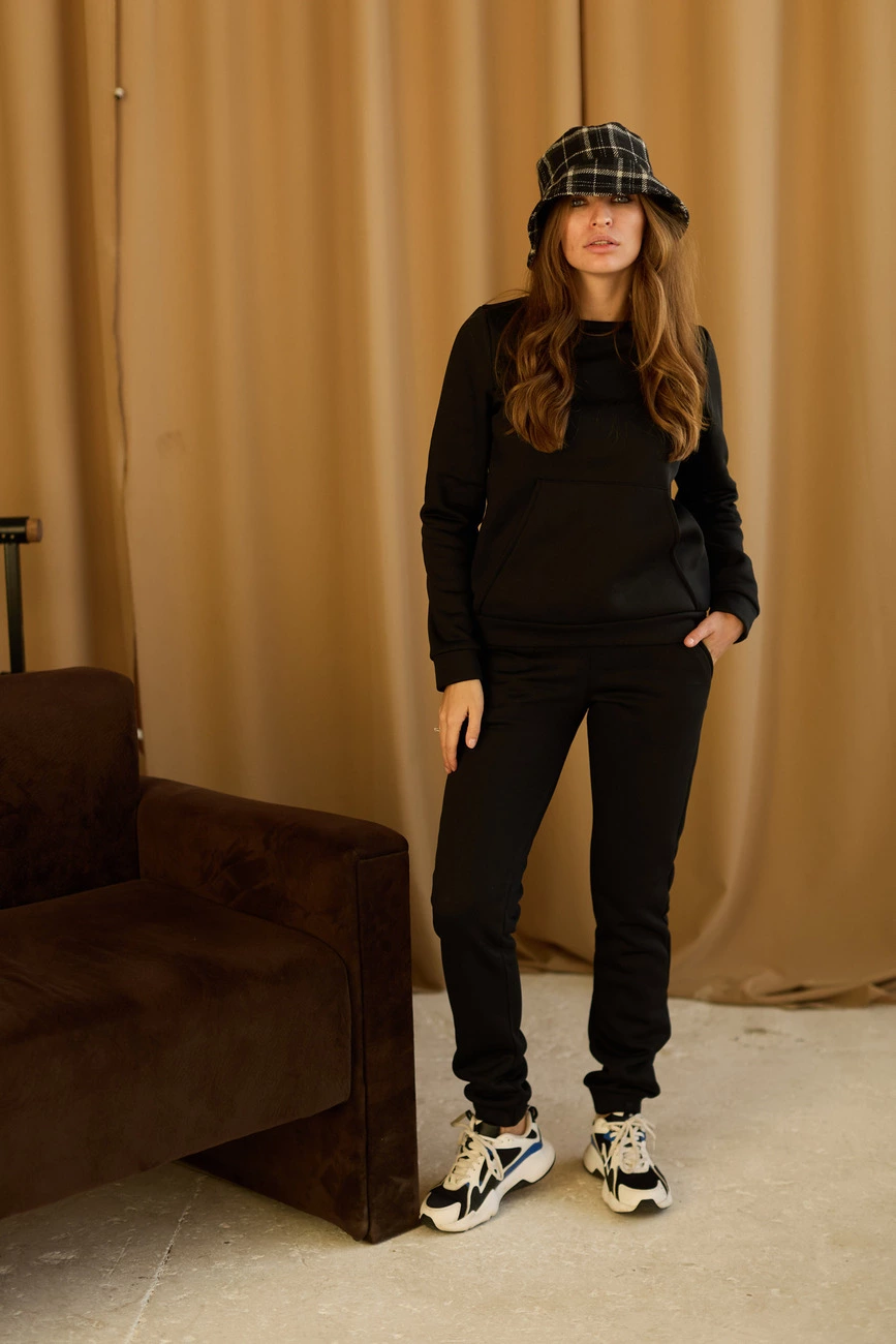Костюм свитшот плюс штаны из теплого зимнего трикотажа на флисе. Кофта с длинными рукавами с манжетами, впереди большой карман-кенгуру; штаны классической длины с манжетами внизу, пояс на резинке, по бокам карманы