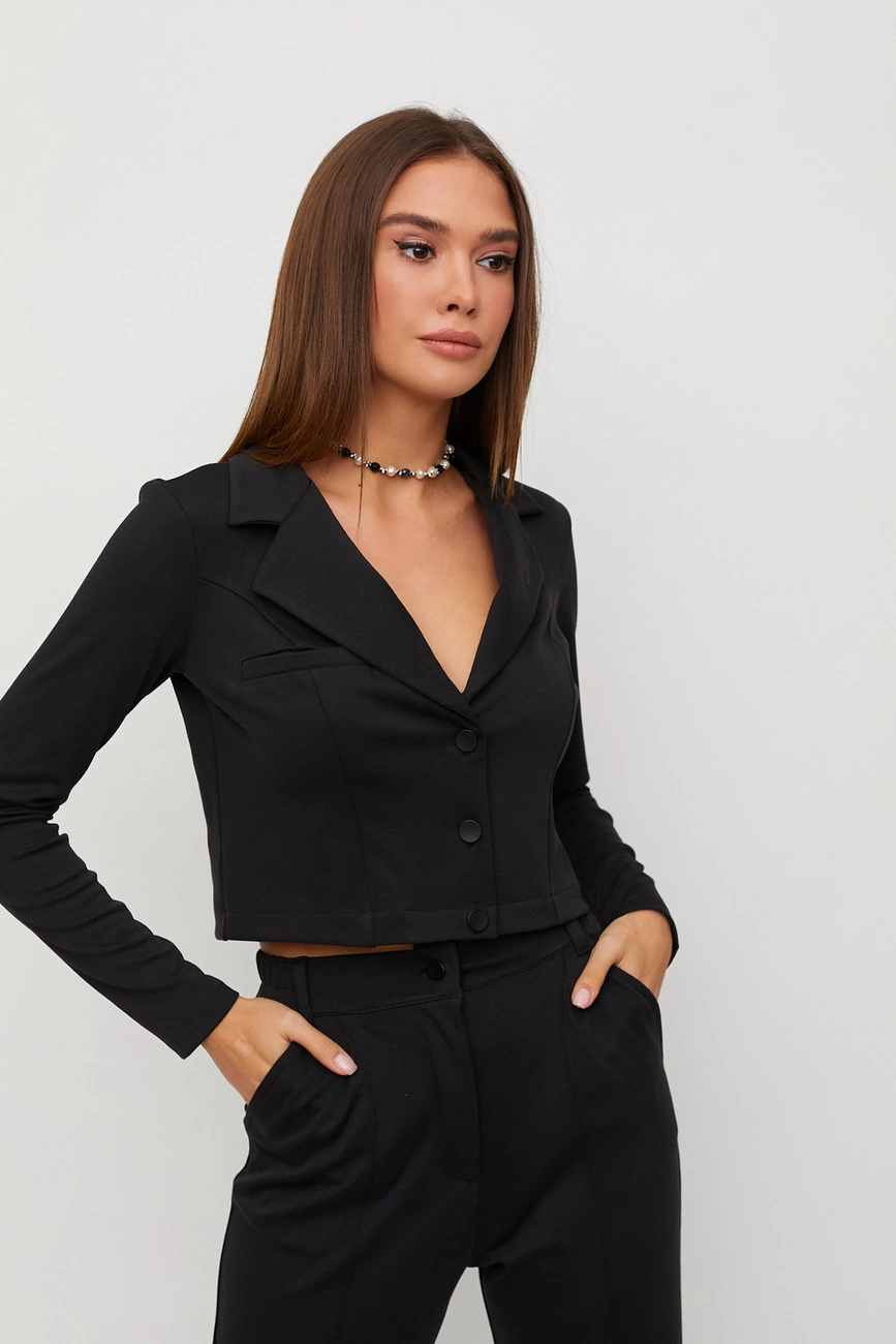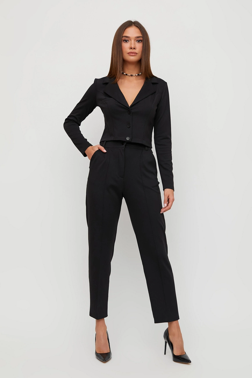 Костюм пиджак плюс брюки из тянущегося плотного трикотажа. Пиджак укороченного кроя с длинным рукавом, слегка приталенный; брюки прямого с высокой посадкой, впереди отстрочка-стрелки, есть карманы, застежка: молния и пуговица