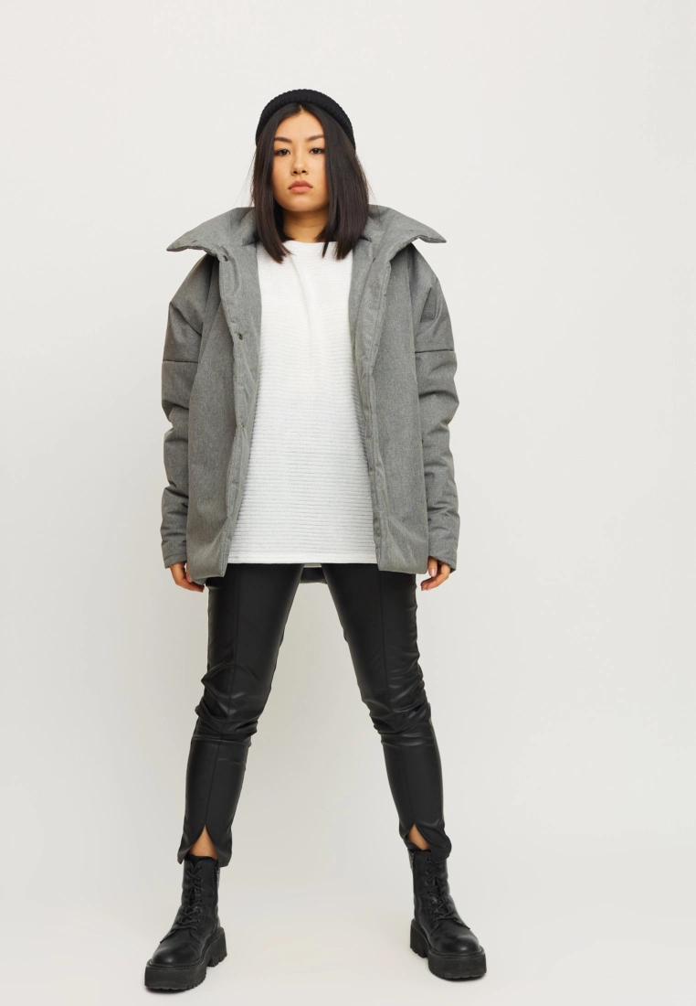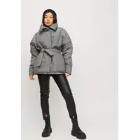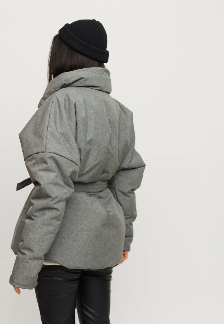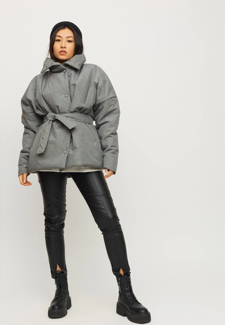 Демисезонная объемная куртка с высоким воротником; крой - летучая мышь; спущенная линия плеча; есть карманы. Застежка: кнопки, пояс