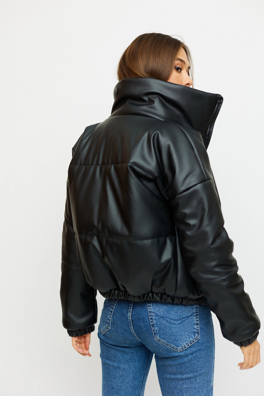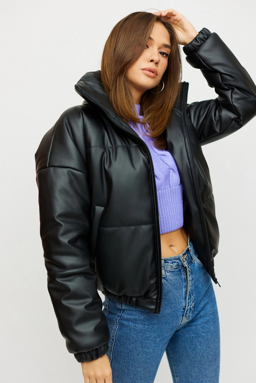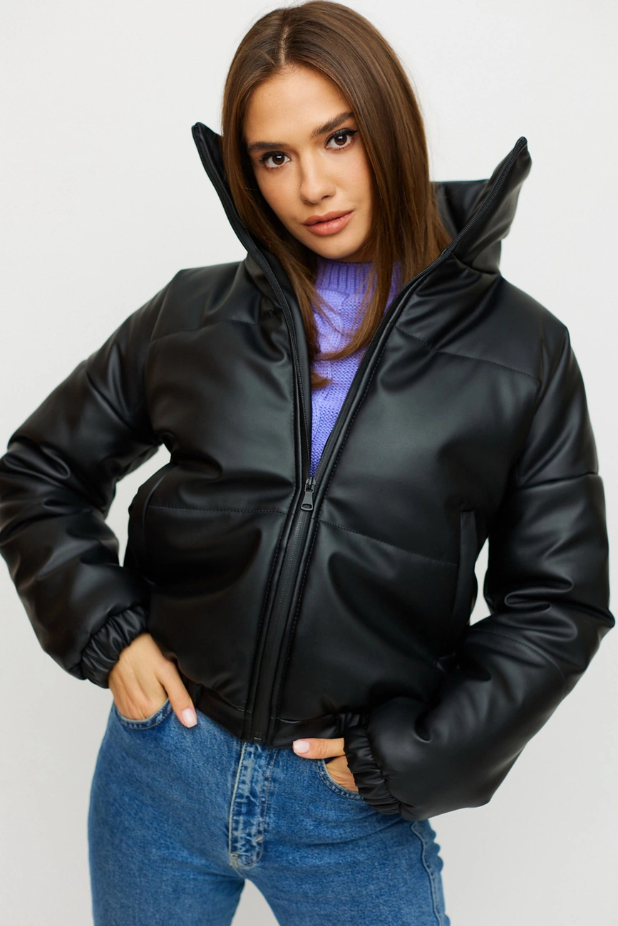 Демисезонная объемная куртка с высоким воротником; спущенная линия плеча; рукава и низ изделия присобраны на резинку; есть карманы; застежка: молния