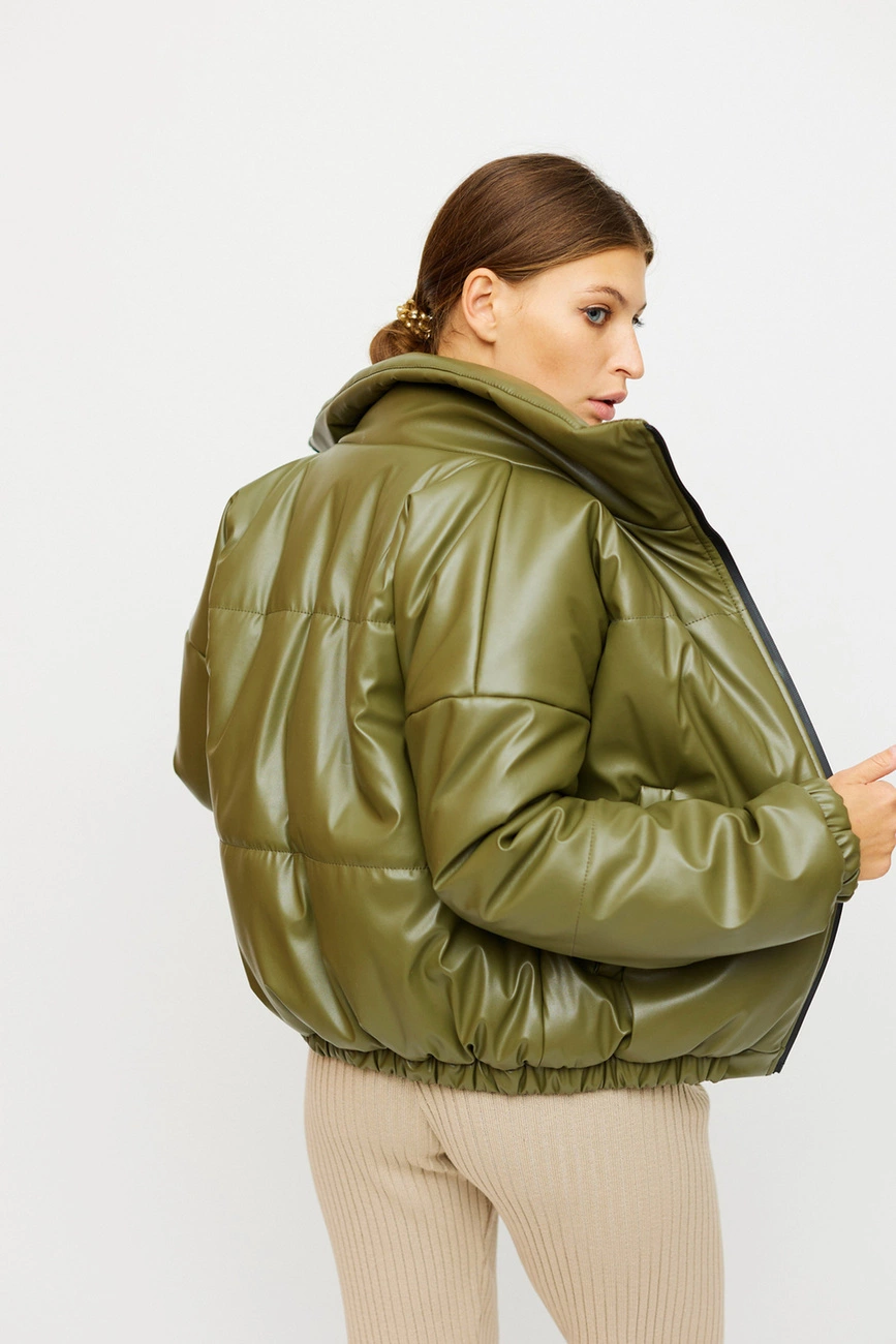 Демисезонная объемная куртка с высоким воротником; спущенная линия плеча; рукава и низ изделия присобраны на резинку; есть карманы; застежка: молния