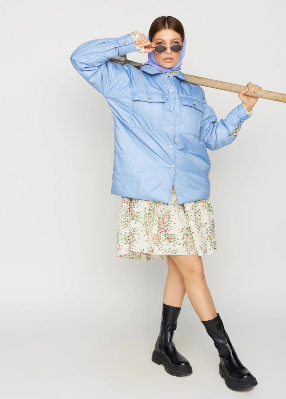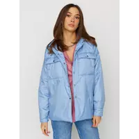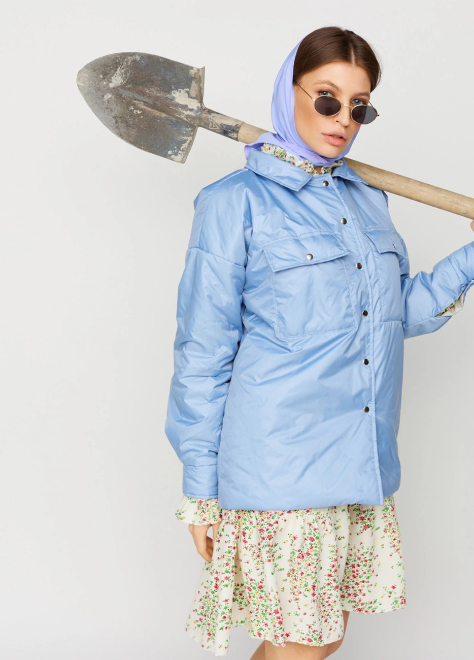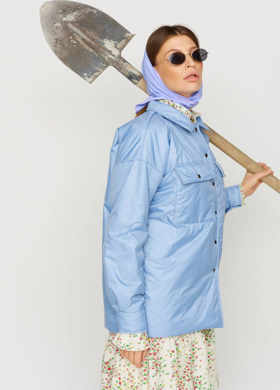 Куртка-рубашка свободного кроя из плащевки с небольшим утеплителем, отложной воротник, спущенная линия плеча, длина до середины бедра, на груди накладные карманы. Застежка: кнопки.