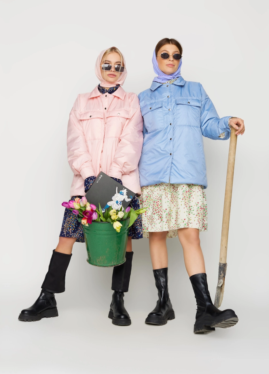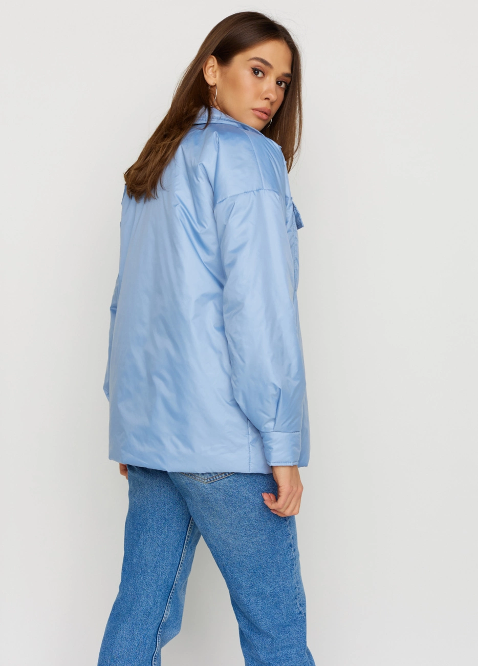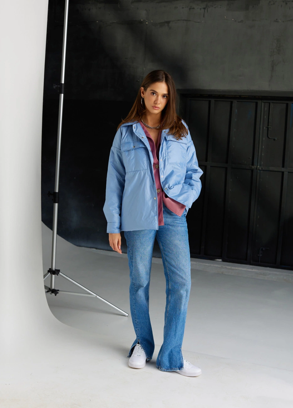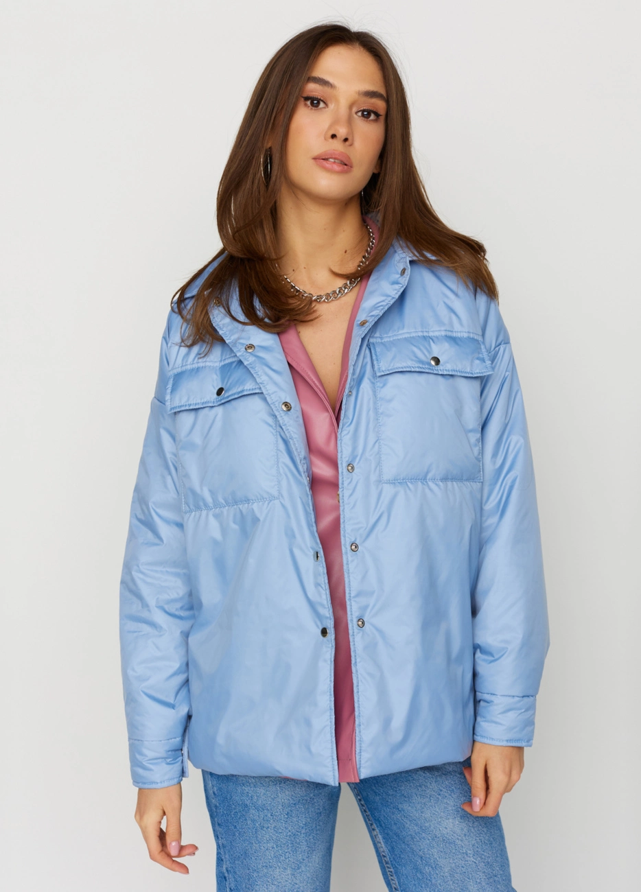 Куртка-рубашка свободного кроя из плащевки с небольшим утеплителем, отложной воротник, спущенная линия плеча, длина до середины бедра, на груди накладные карманы. Застежка: кнопки.