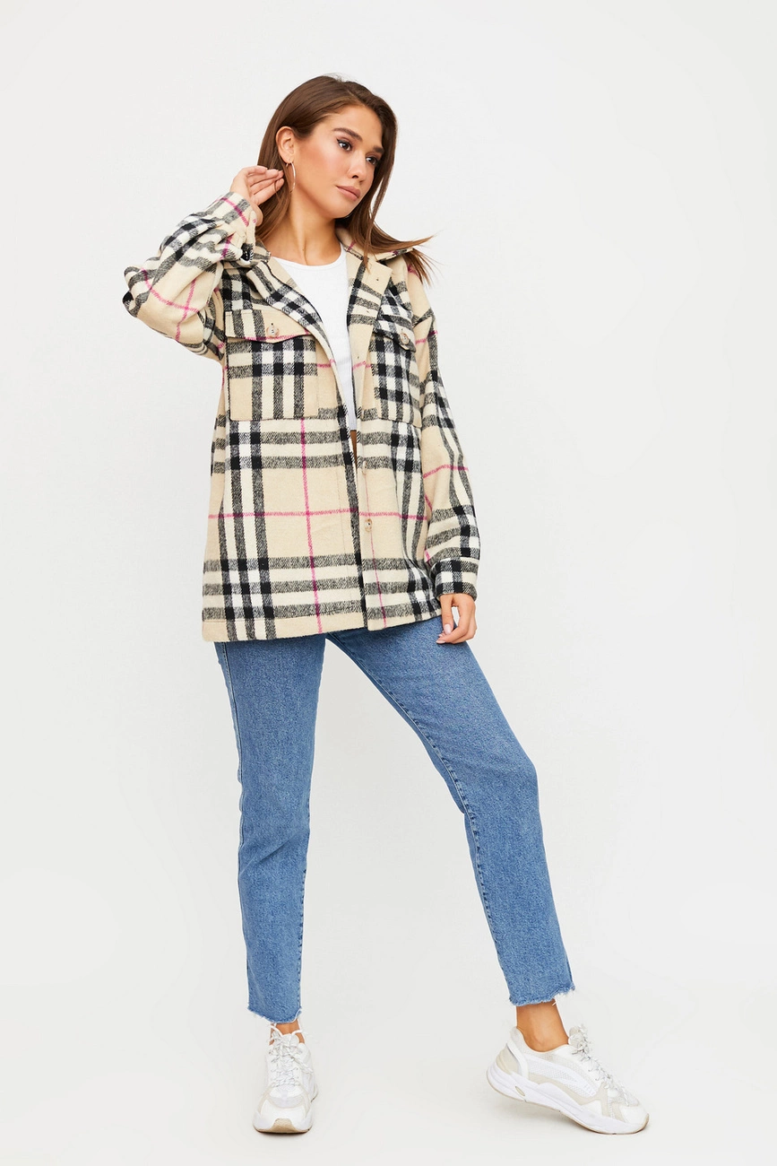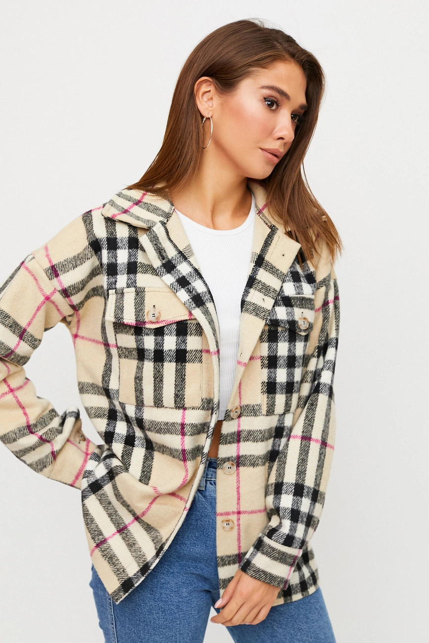 Куртка-рубашка свободного кроя их плотного кашемира, отложной воротник, спущенная линия плеча, длина до середины бедра, на груди накладные карманы.