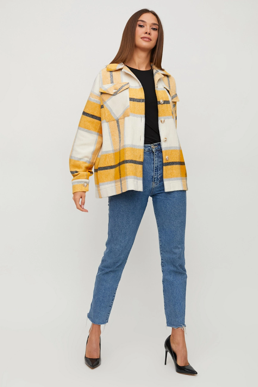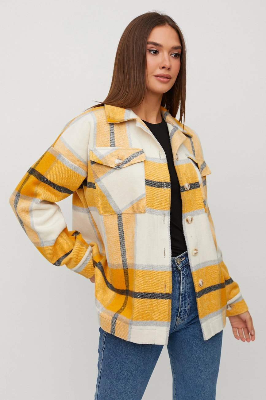Куртка-рубашка свободного кроя их плотного кашемира, отложной воротник, спущенная линия плеча, длина до середины бедра, на груди накладные карманы.