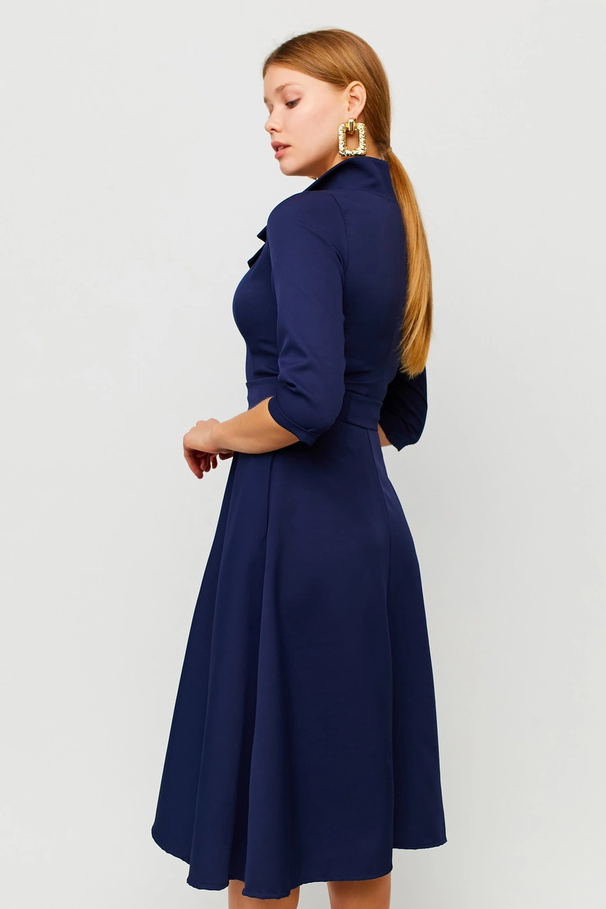 воротник-стойка, рукав 3/4 с отворотом, приталенный верх, юбка