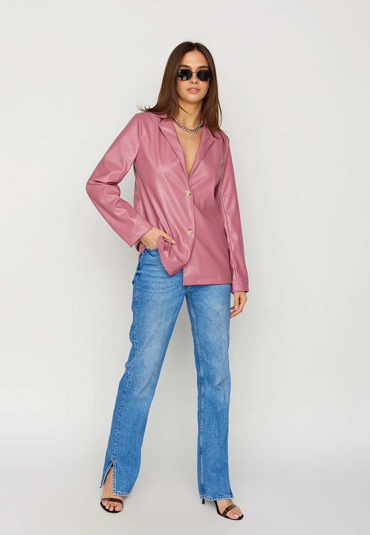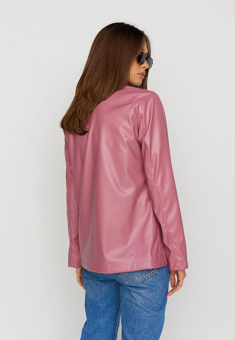 Однобортный жакет из экокожи, прямой однобортный фасон, V-образный вырез, английский воротник, застежка на пуговицы, модель с подкладкой из софта.