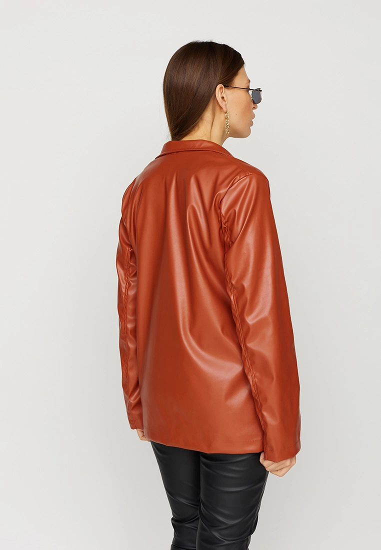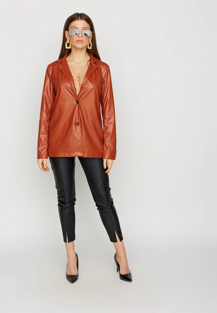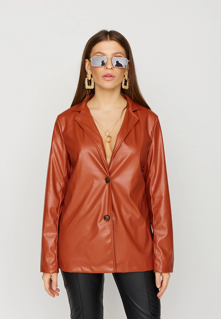 Однобортный жакет из экокожи, прямой однобортный фасон, V-образный вырез, английский воротник, застежка на пуговицы, модель с подкладкой из софта.