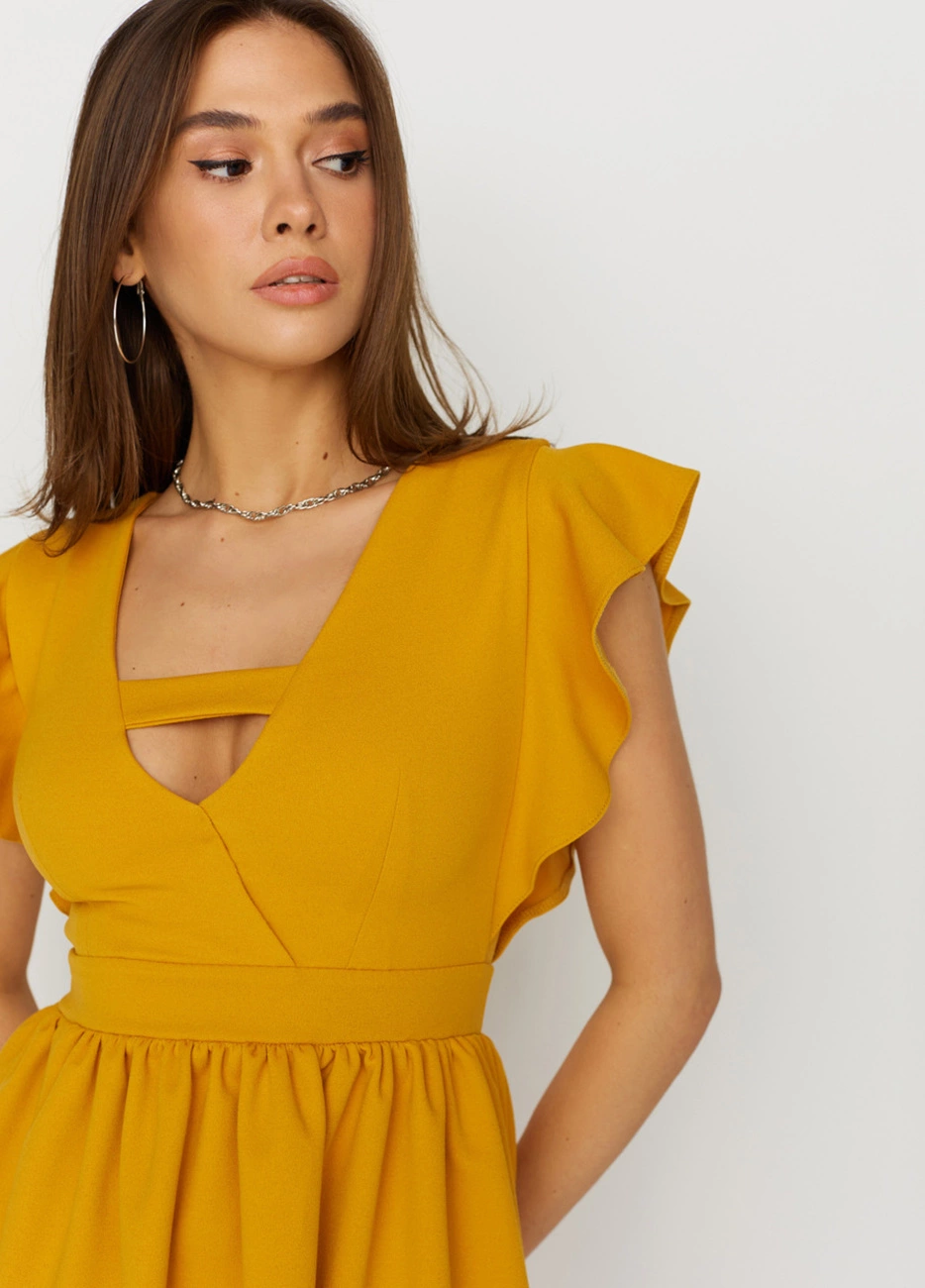 Платье мини из тянущейся фактурной ткани. Глубокий V-образный вырез с эмитацией запаха и перемычкой, по плечу волан, юбка полусолнце.