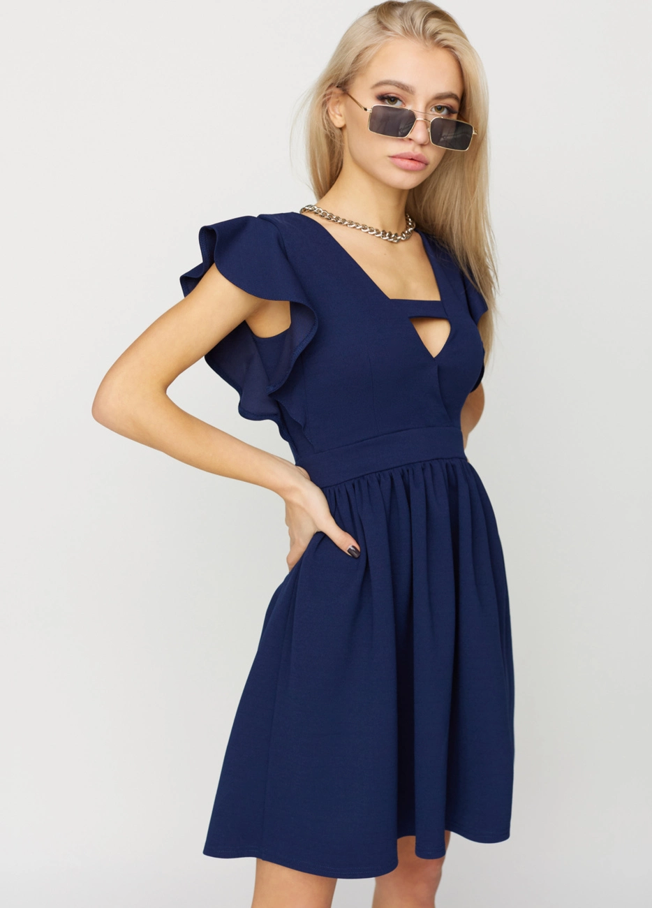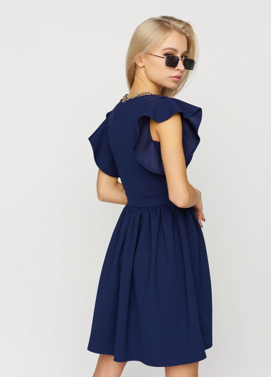 Платье мини из тянущейся фактурной ткани. Глубокий V-образный вырез с эмитацией запаха и перемычкой, по плечу волан, юбка полусолнце.