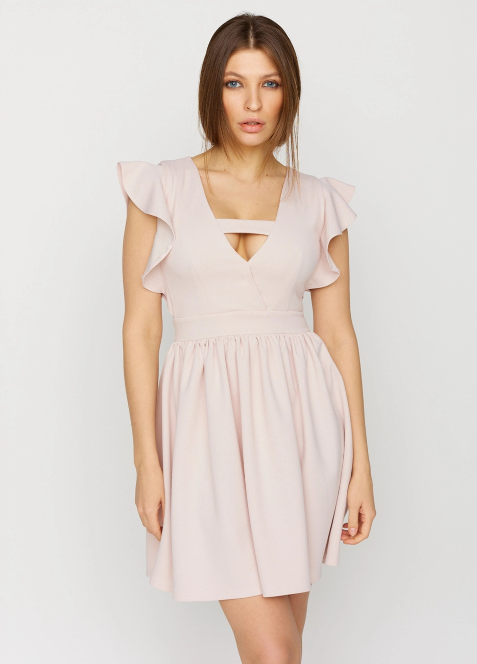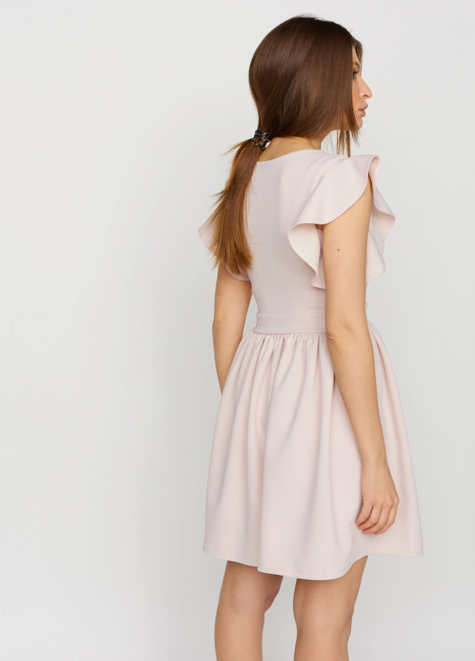 Платье мини из тянущейся фактурной ткани. Глубокий V-образный вырез с эмитацией запаха и перемычкой, по плечу волан, юбка полусолнце.