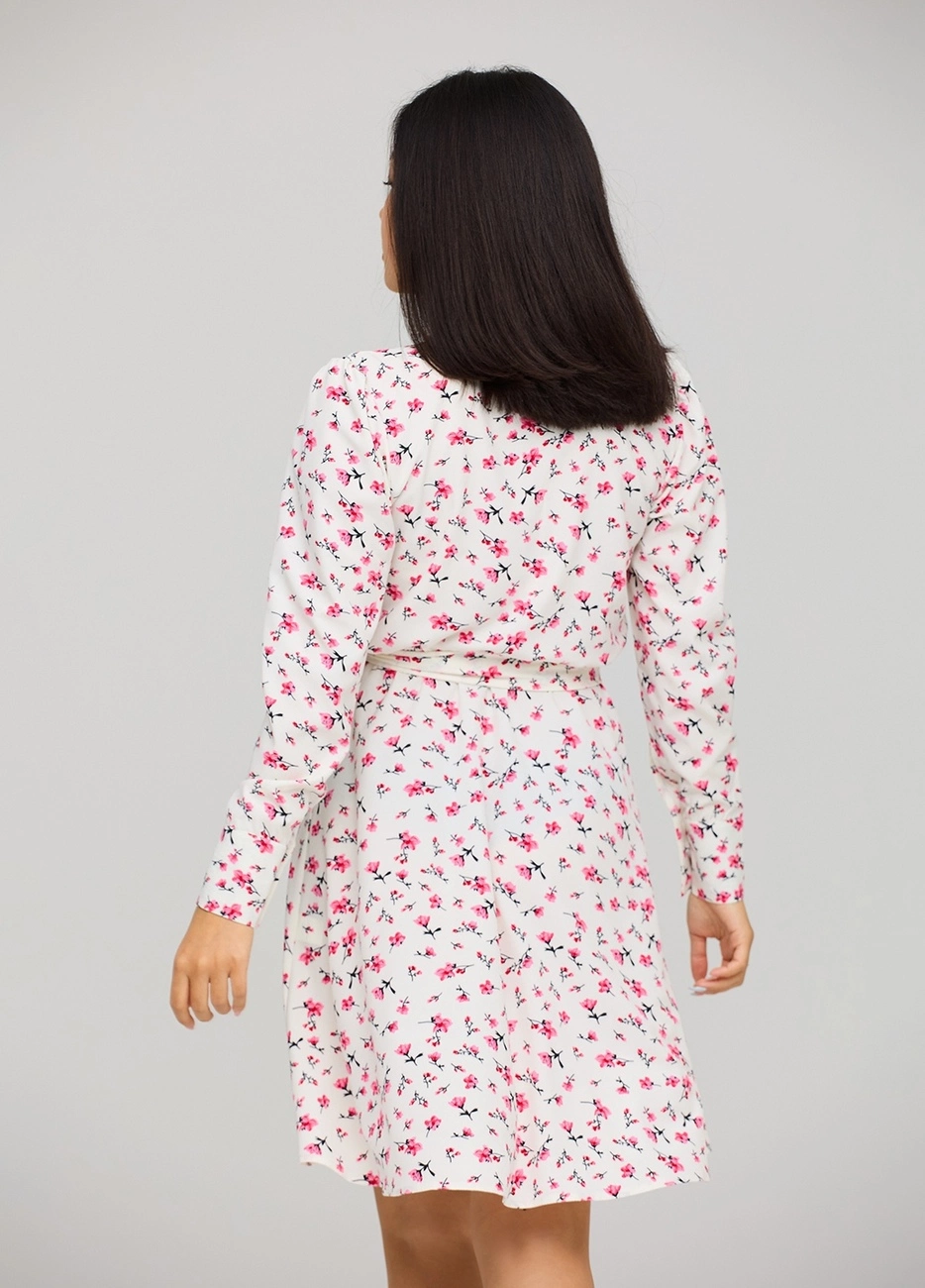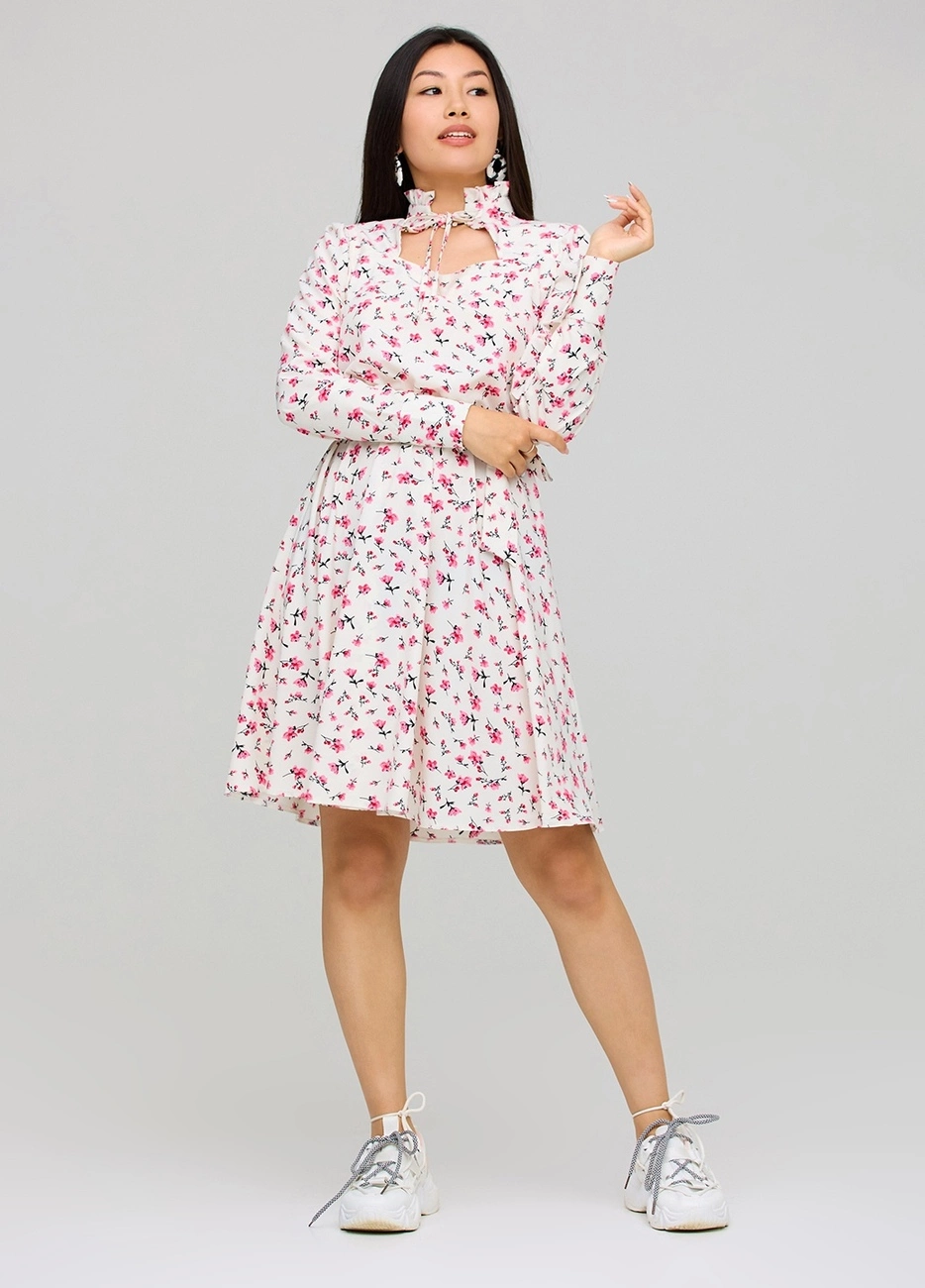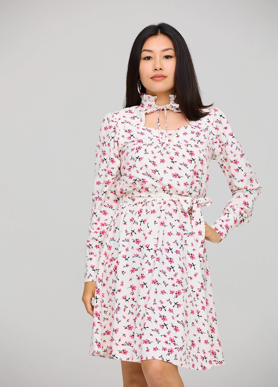 Платье приталенного кроя из приятной летней ткани, воротник-стойка декорирована рюшей с завязкой, по груди графичный вырез, рукав длинный с манжетам на пуговицах, пояс в комплекте