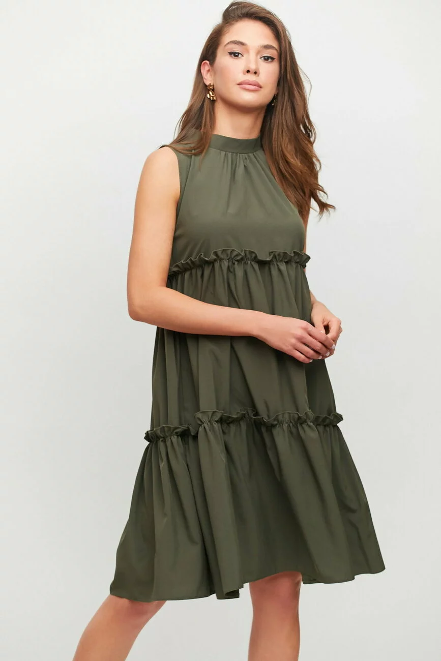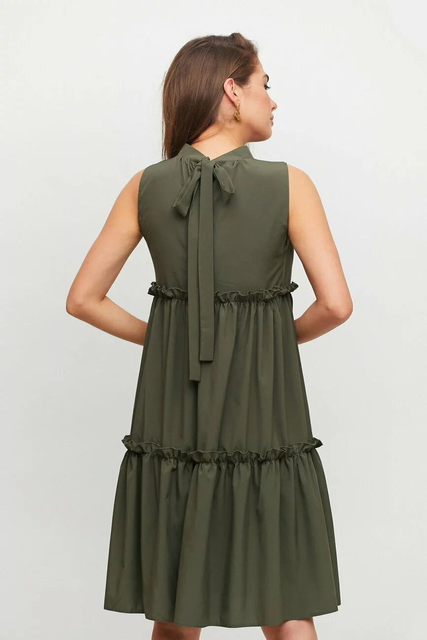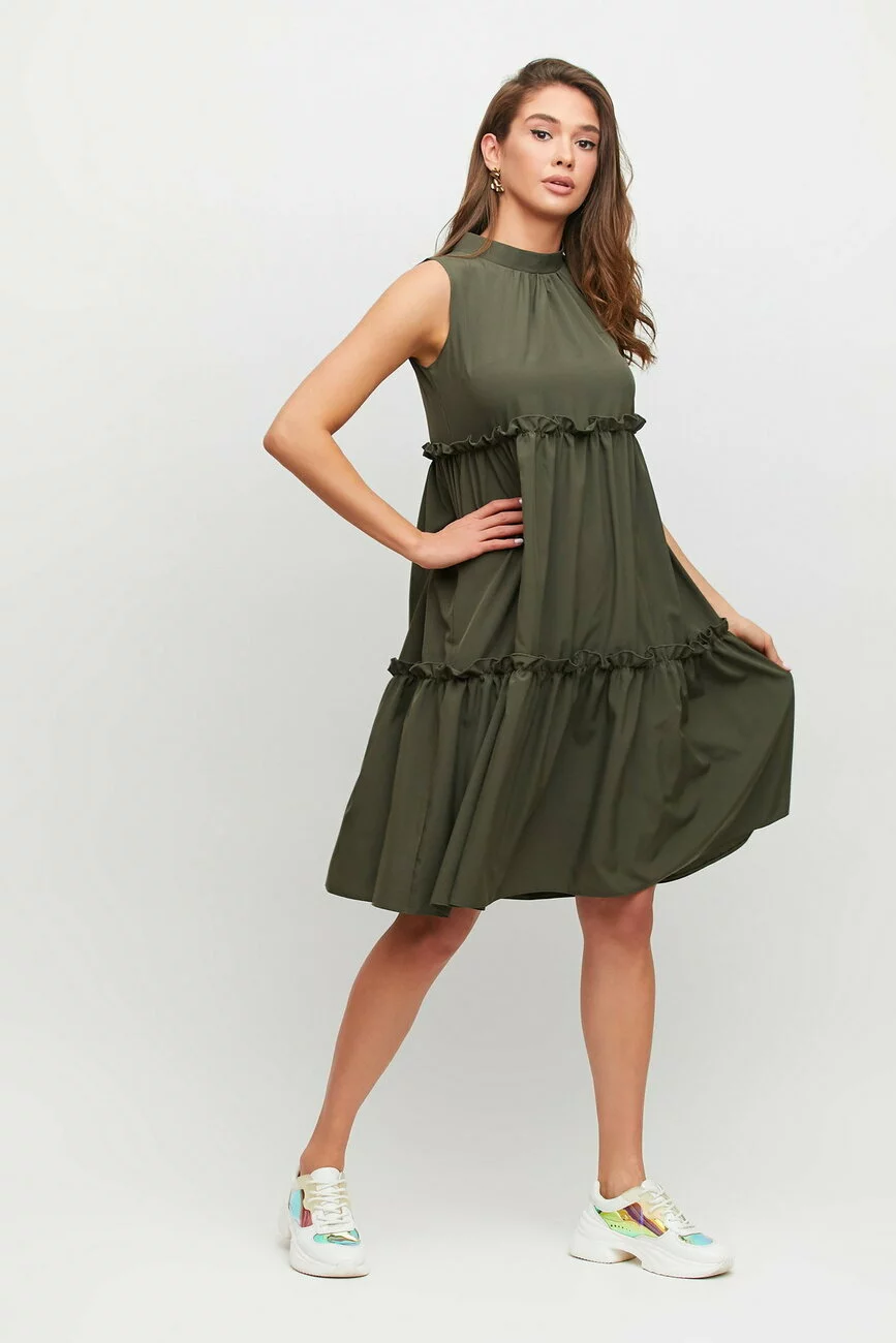 Ярусное платье трапецевидного кроя из приятной на ощупь ткани без рукавов, невысокий воротник-стойка с бантом сзади, длина миди