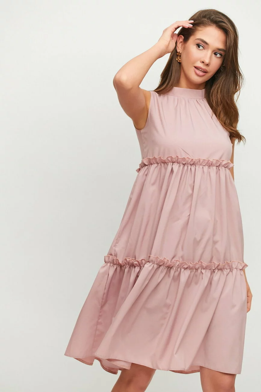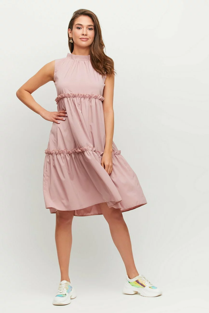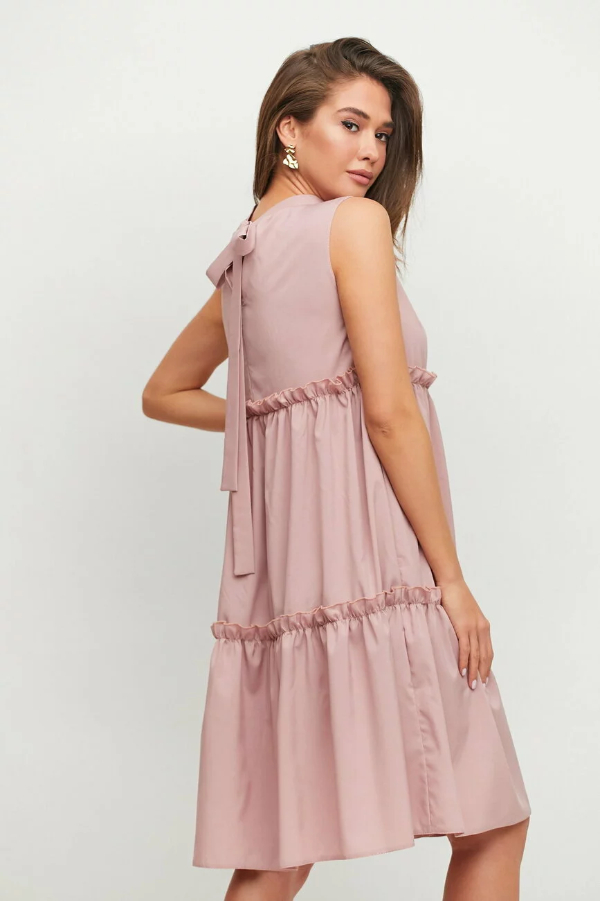 Ярусное платье трапецевидного кроя из приятной на ощупь ткани без рукавов, невысокий воротник-стойка с бантом сзади, длина миди