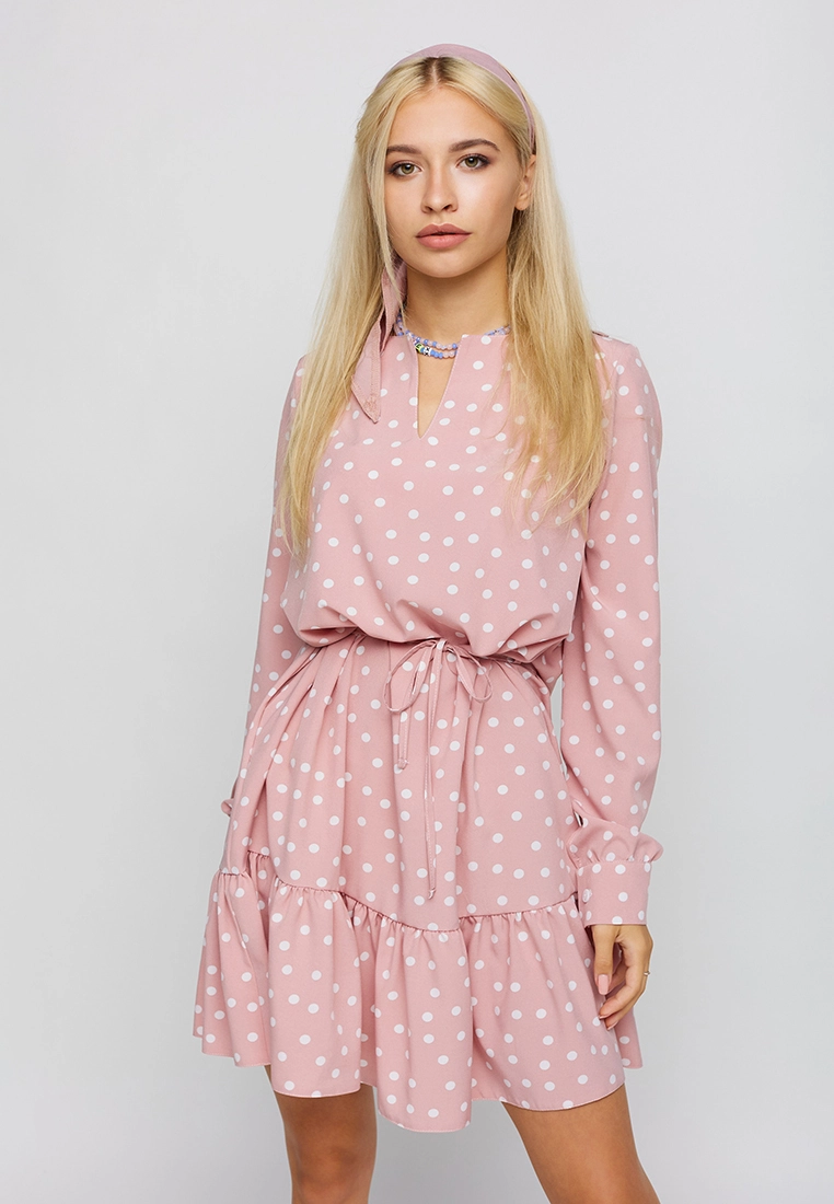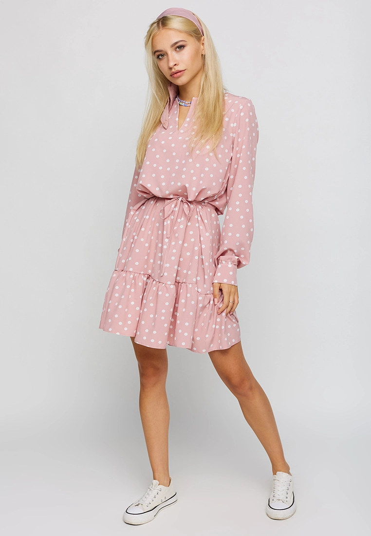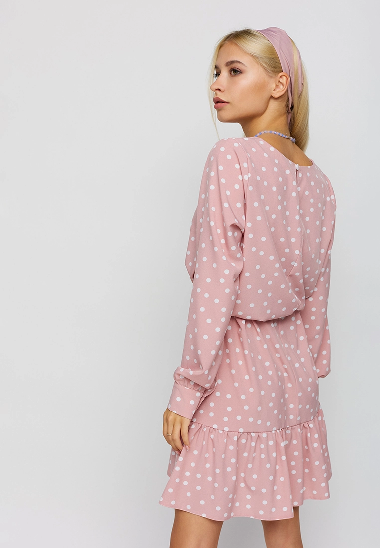Платье длиной выше колена из легкой ткани, впереди неглубокий вырез, рукав длинный широкий с манжетами, по низу изделия волан; застежка: пуговица сзади