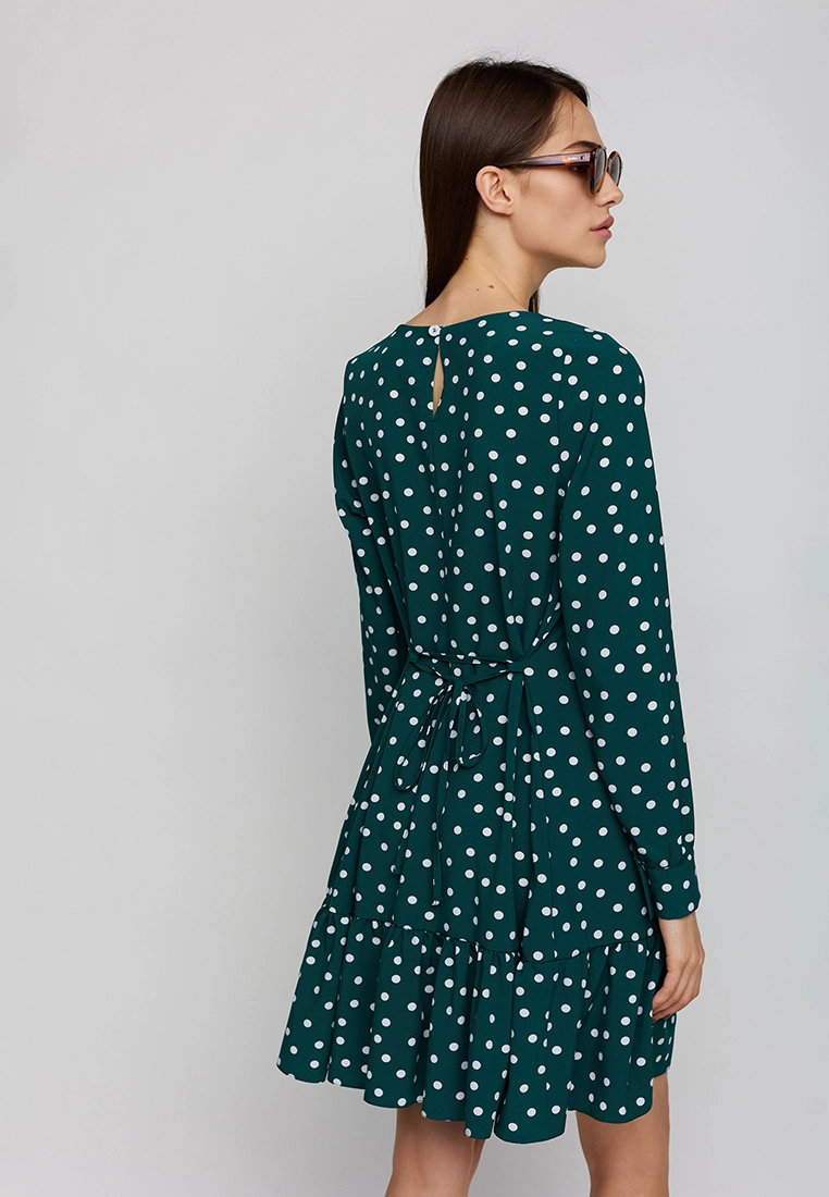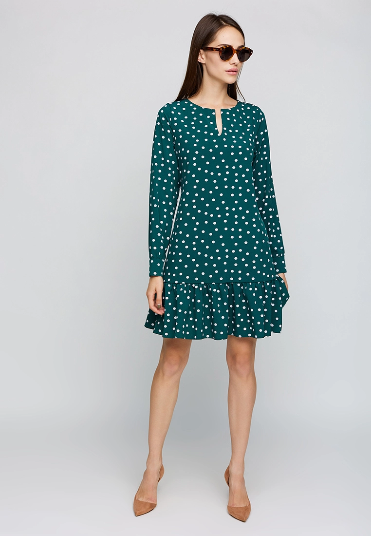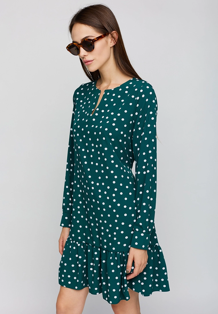 Платье длиной выше колена из легкой ткани, впереди неглубокий вырез, рукав длинный широкий с манжетами, по низу изделия волан; застежка: пуговица сзади
