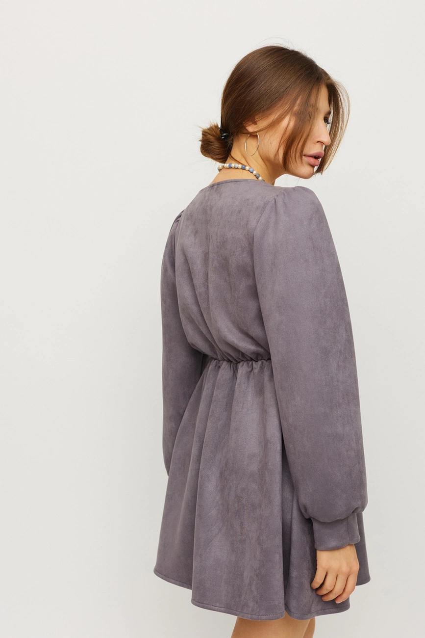 Платье мини из искуственного замша. Фигурное декольте, талия собрана на резинку, юбка полусолнце, рукав широкий со сборкой по плечу, по переду планка с пуговицами