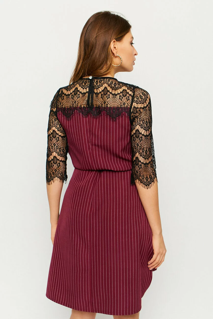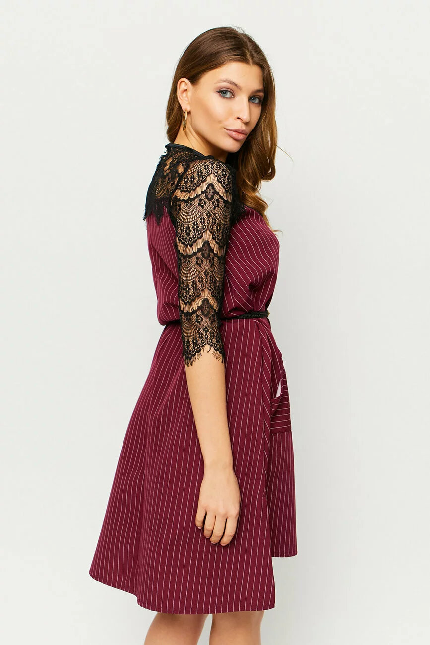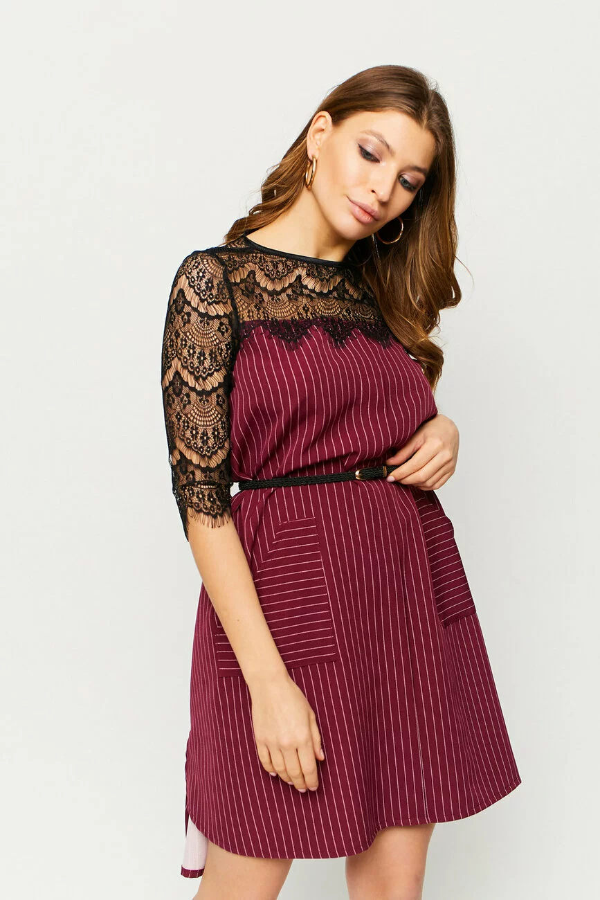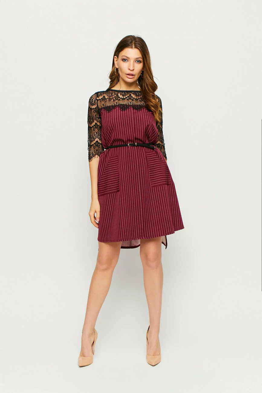 Платье асимметричного кроя из плотной слегка тянущейся костюмной ткани, по бокам небольшие разрезы, декольте и рукава выполнены из гипюра черного цвета, на бедрах накладные карманы, сзади вырез-капелька