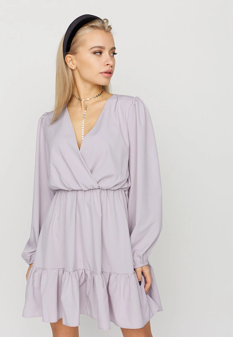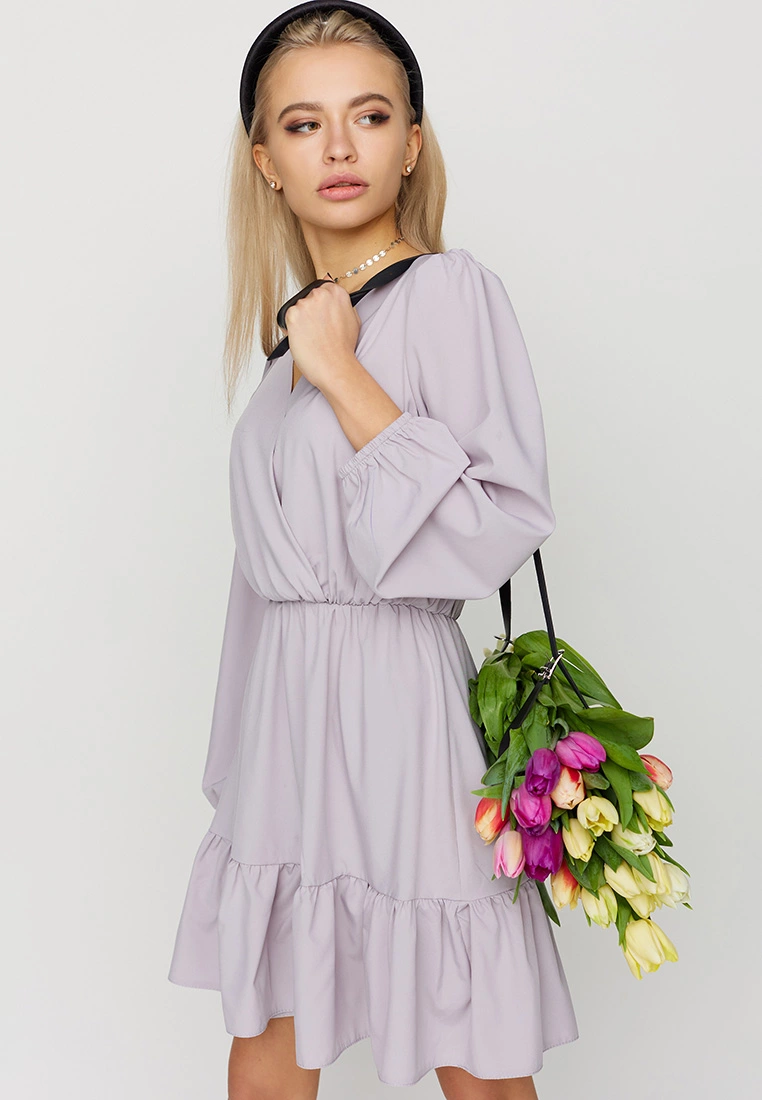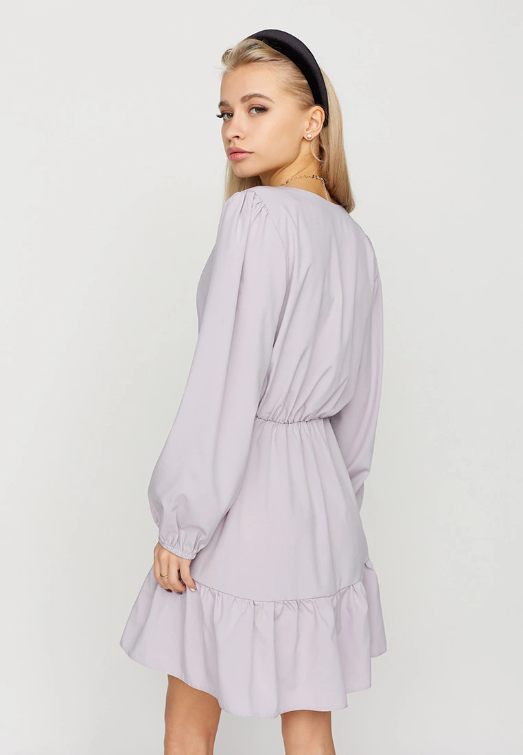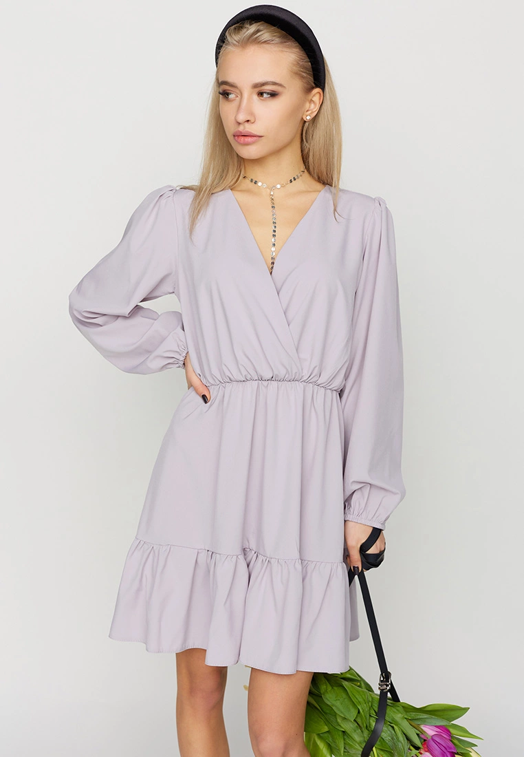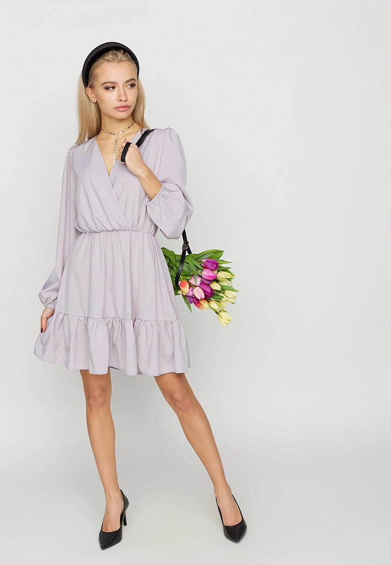 Платье свободного кроя из легкой ткани; верх - имитация запаха; юбка декорирована воланом, рукав длинный