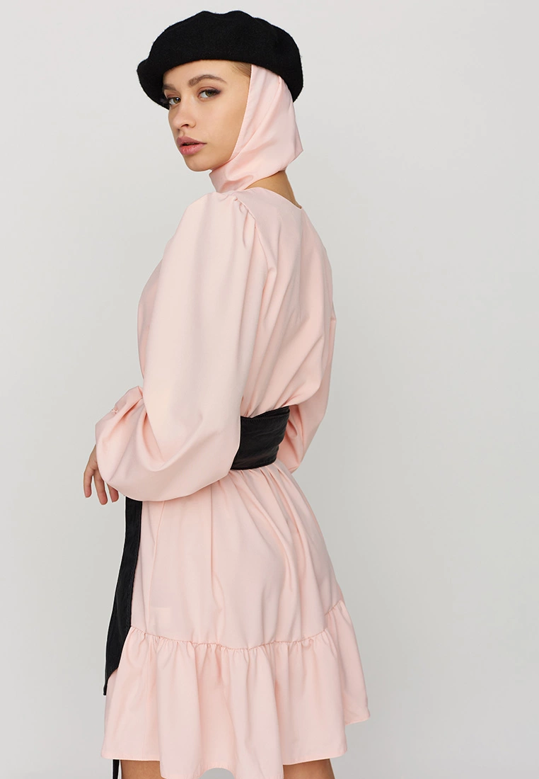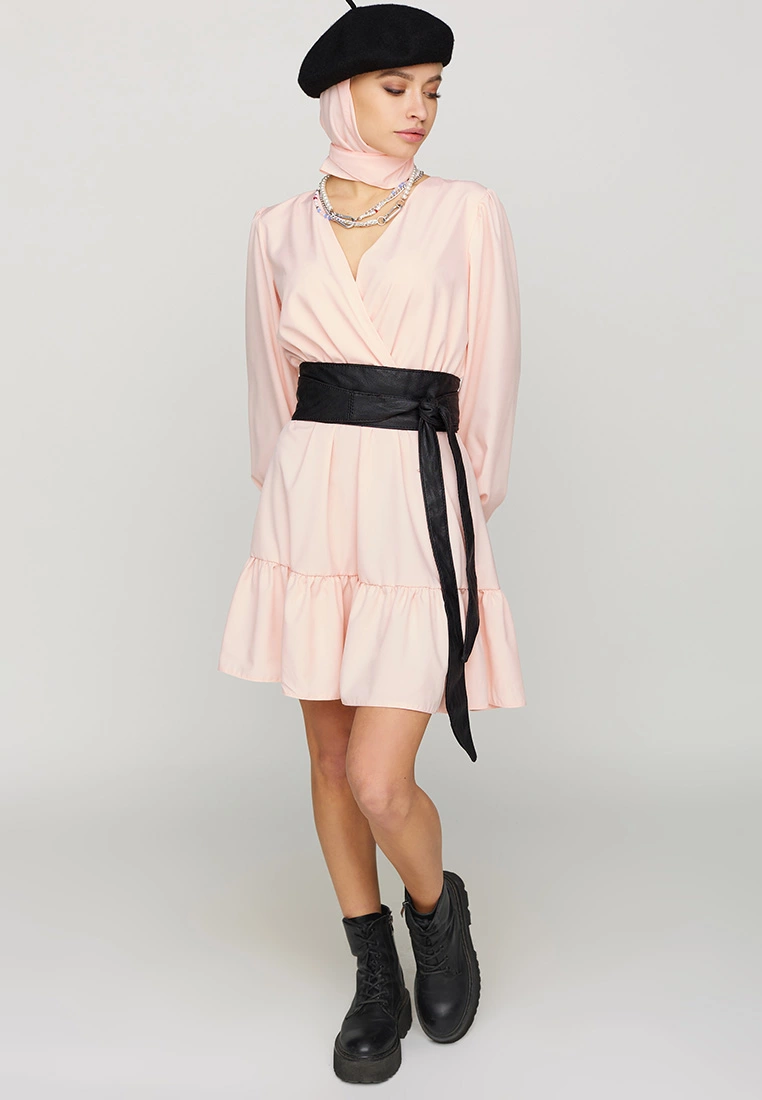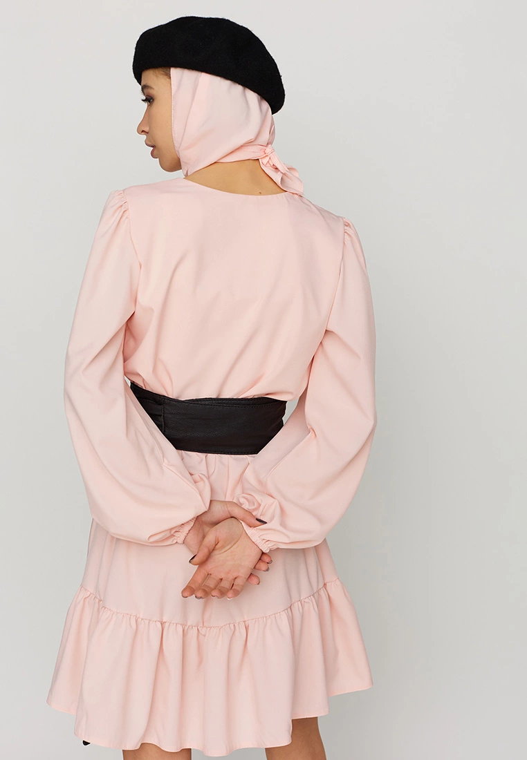 Платье свободного кроя из легкой ткани; верх - имитация запаха; юбка декорирована воланом, рукав длинный