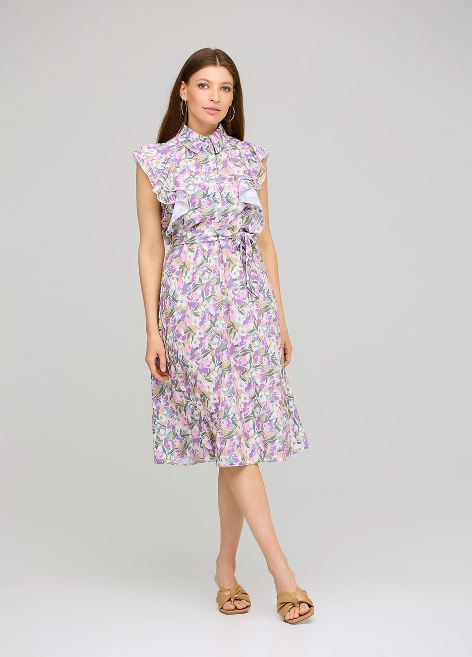 Платье приталенного кроя из приятной на ощупь ткани, отложной воротник, по груди декор в виде воланов , отрезная линия талии, длина миди; застежка: пуговицы, пояс в комплекте