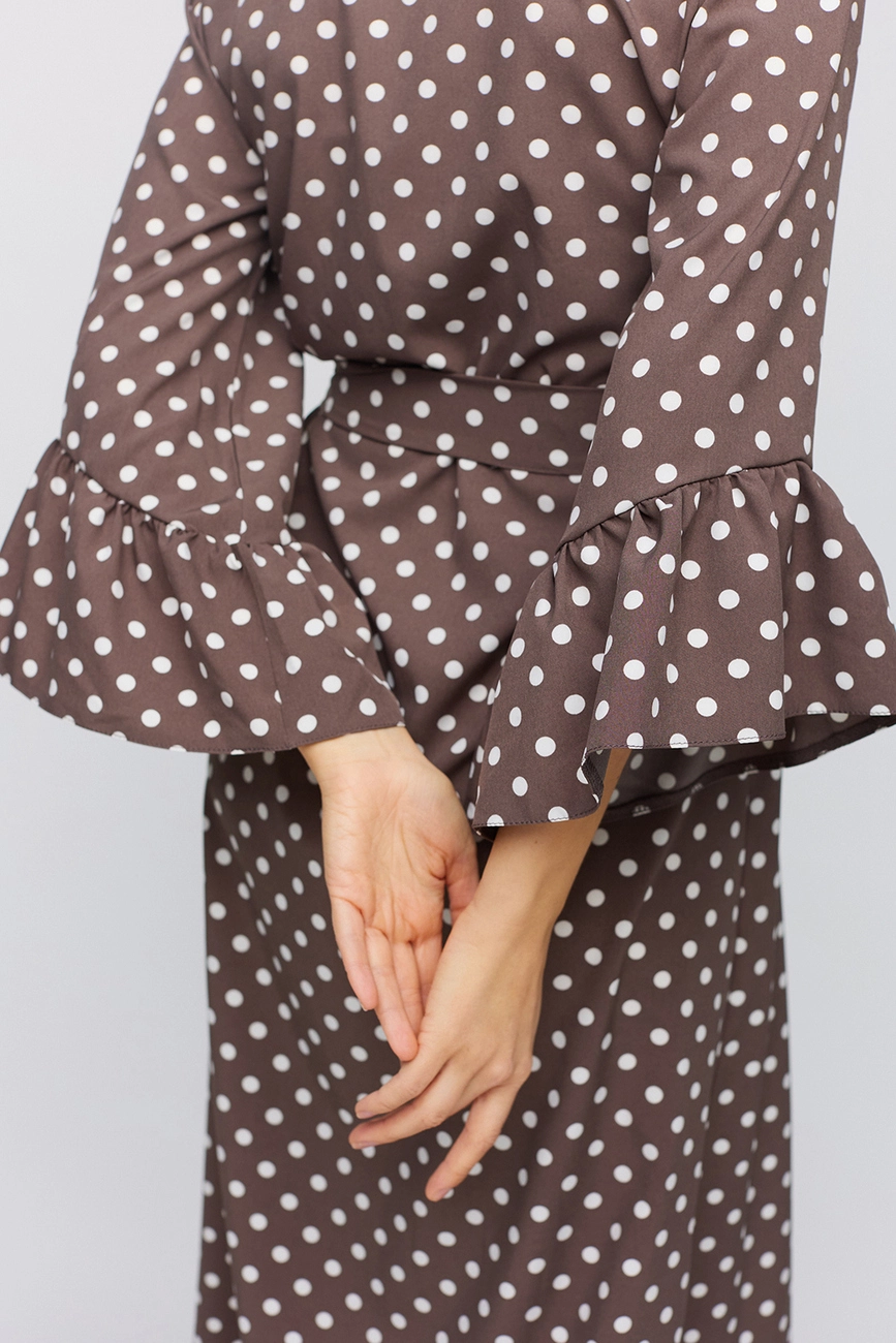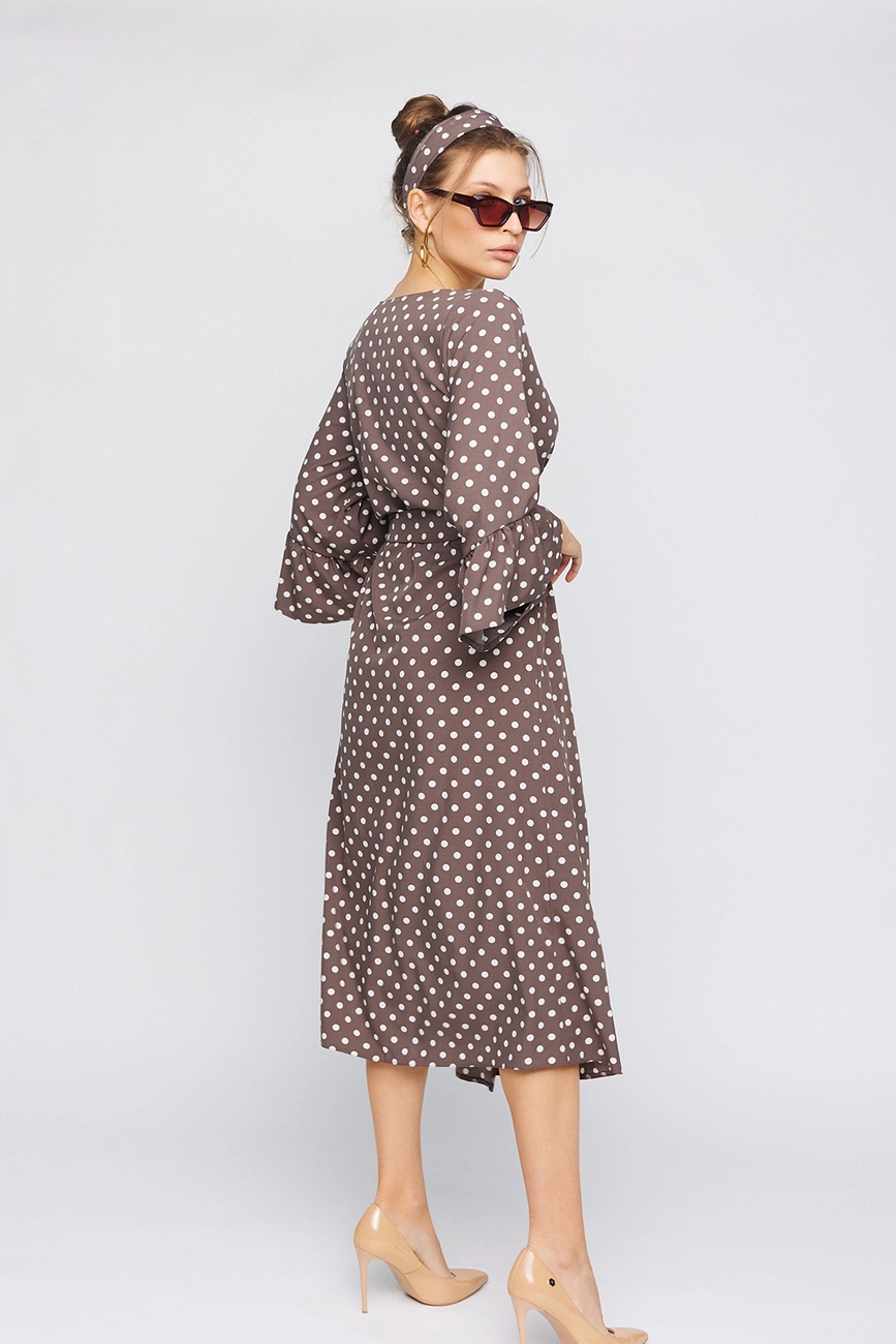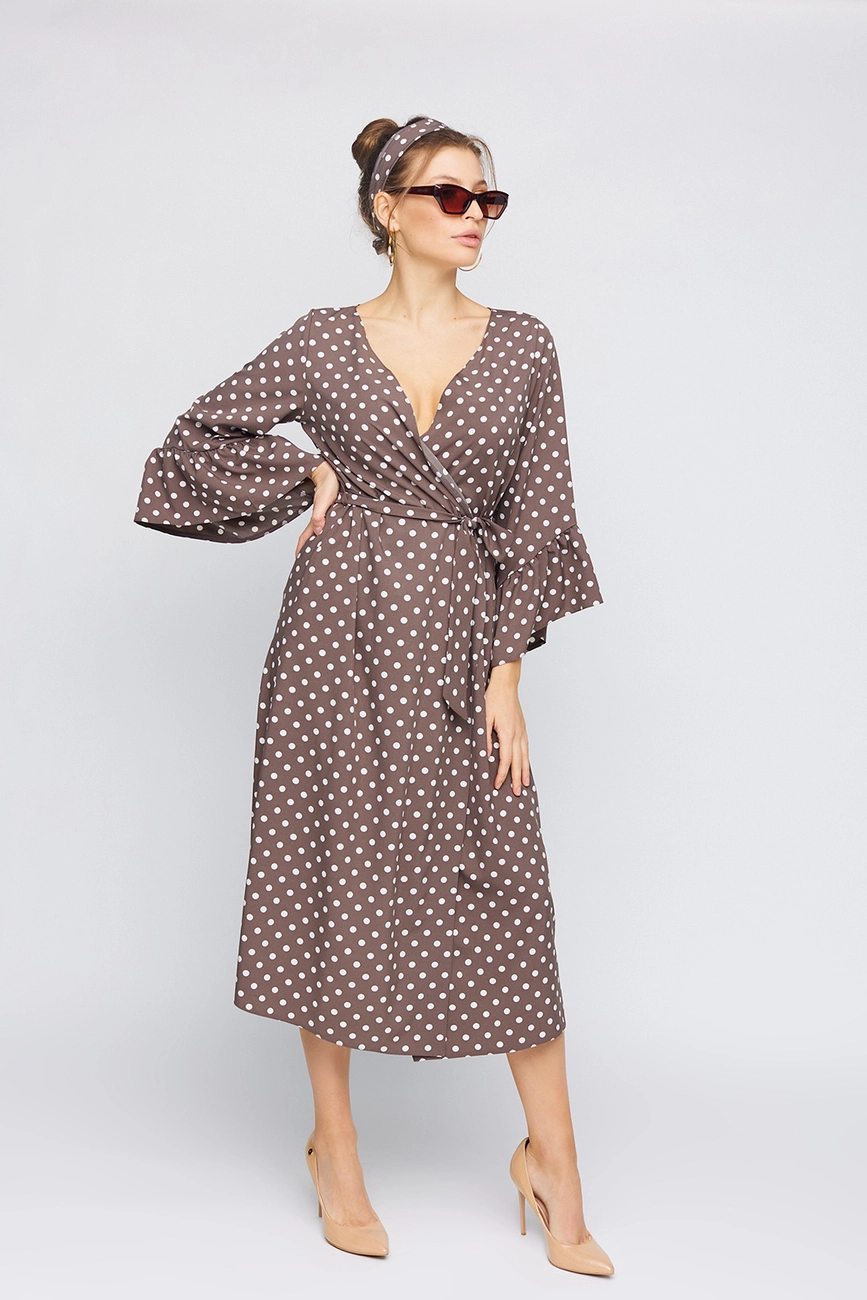 Платье с запахом из лёгкой, струящейся ткани, Длина макси, глубокое декольте, длинный рукав, по краю рукава волны, пояс съёмный.