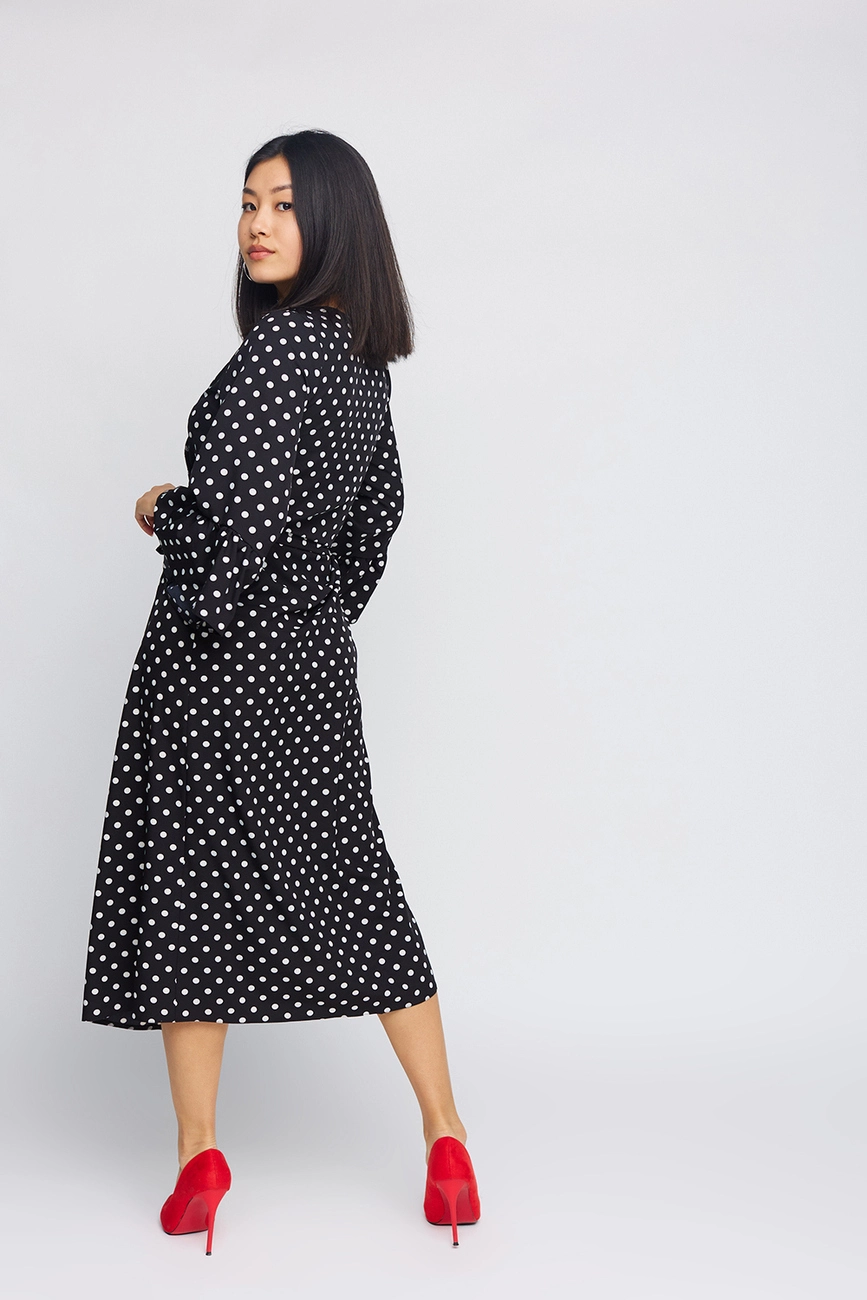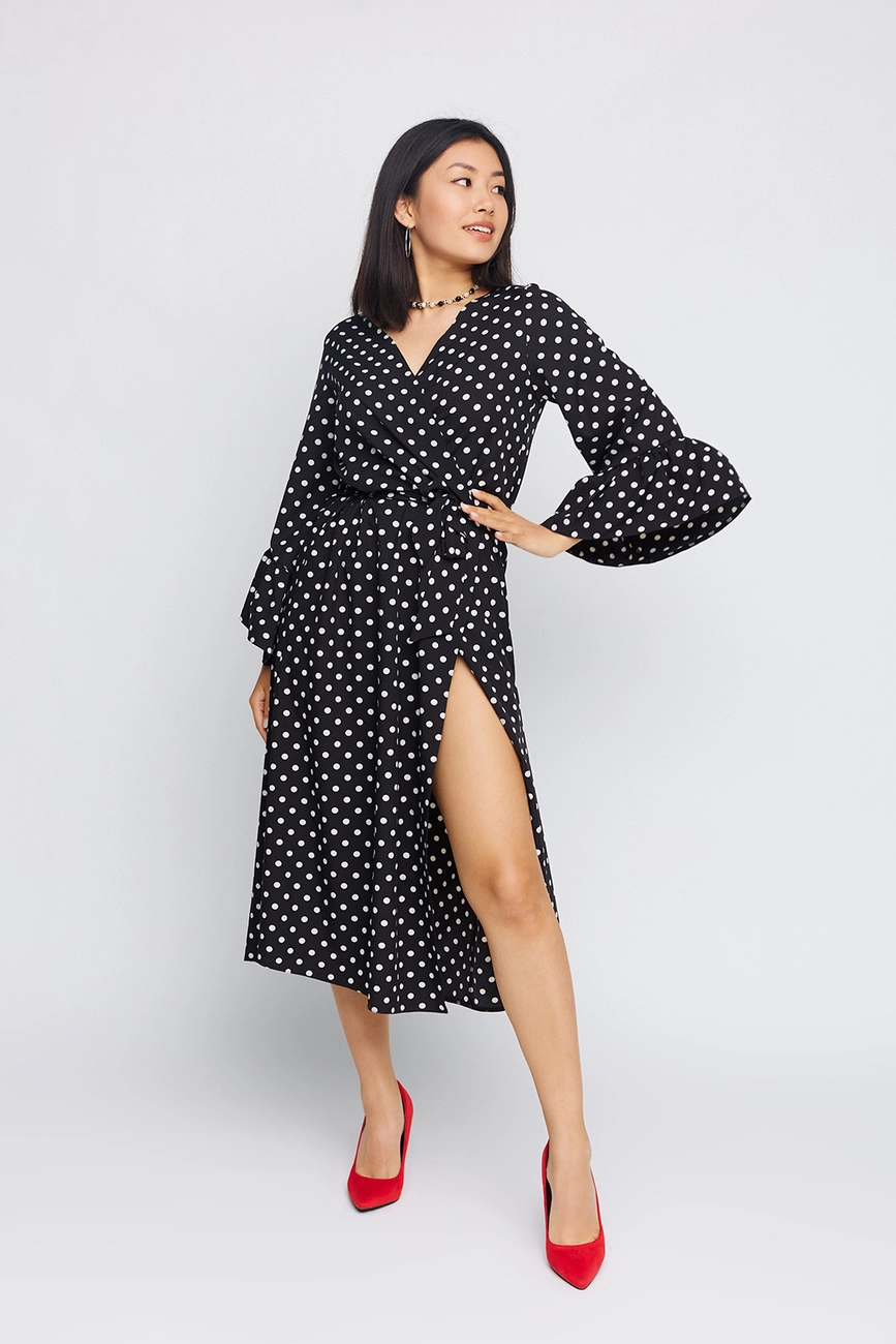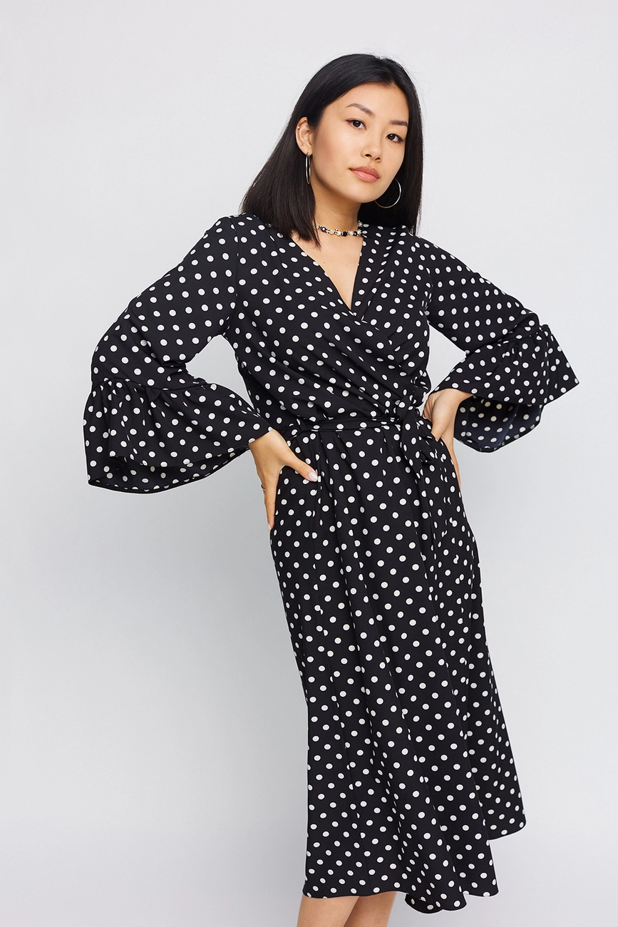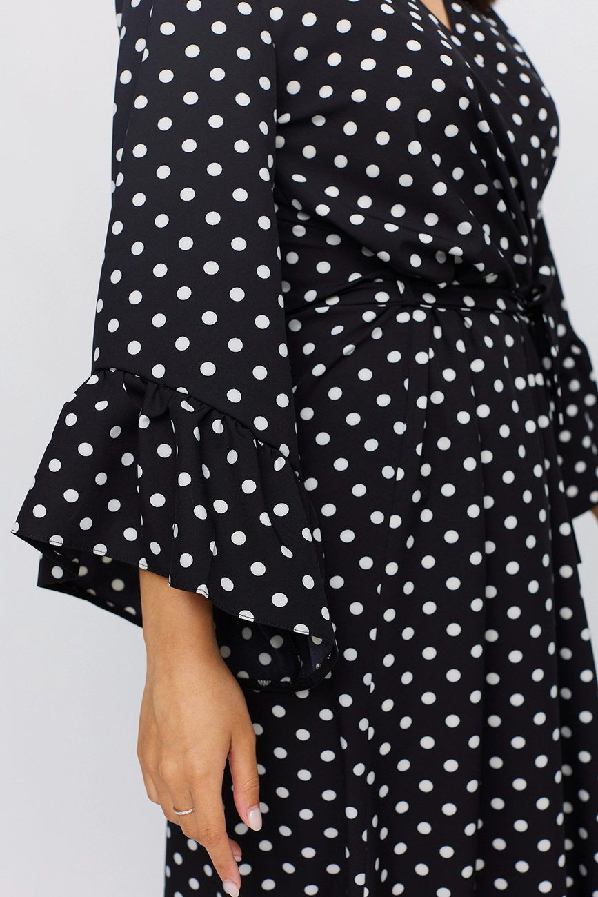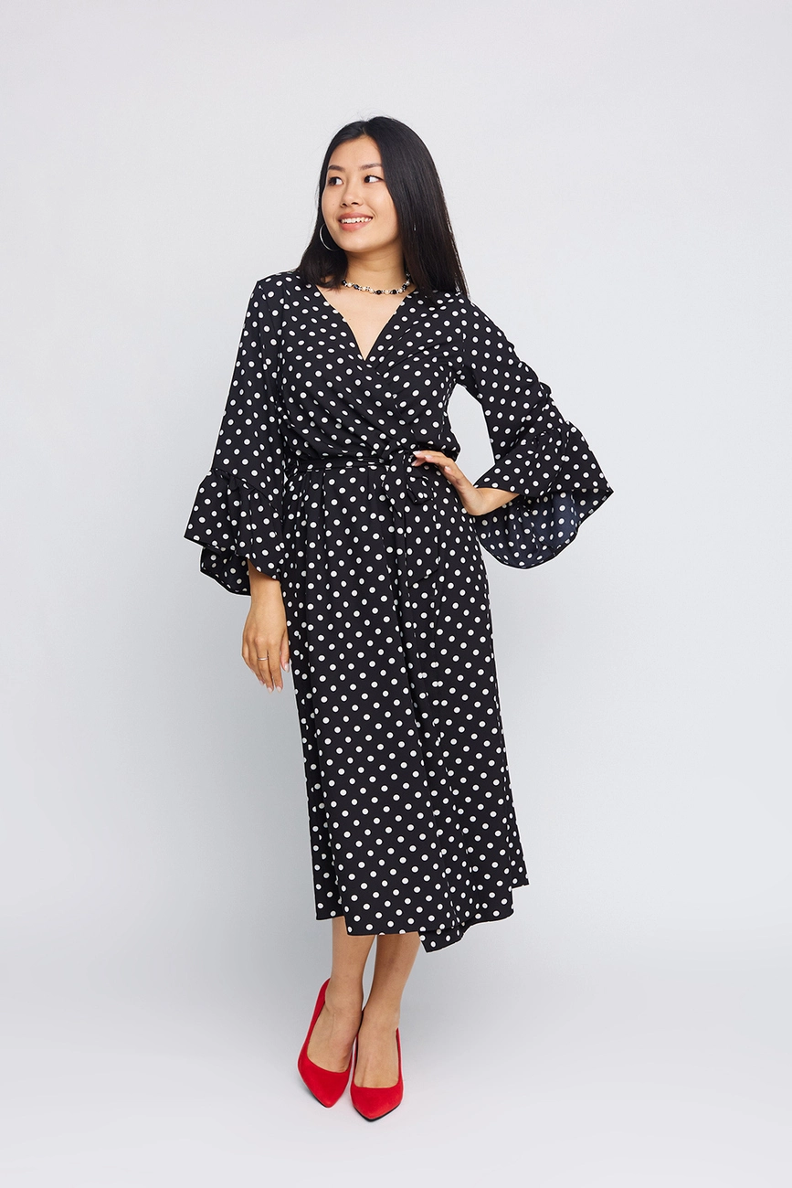 Платье с запахом из лёгкой, струящейся ткани, Длина макси, глубокое декольте, длинный рукав, по краю рукава волны, пояс съёмный.