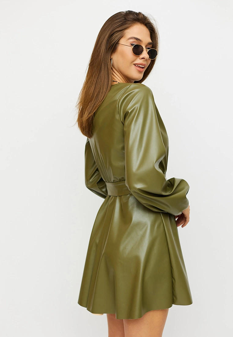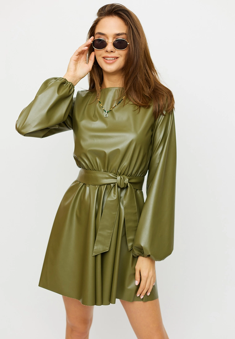 Платье мини длины из эко-кожи, широкий длинный рукав собран резинкой, по линии талии резинка плюс пояс, юбка солнце-клеш; застежка: пуговица сзади