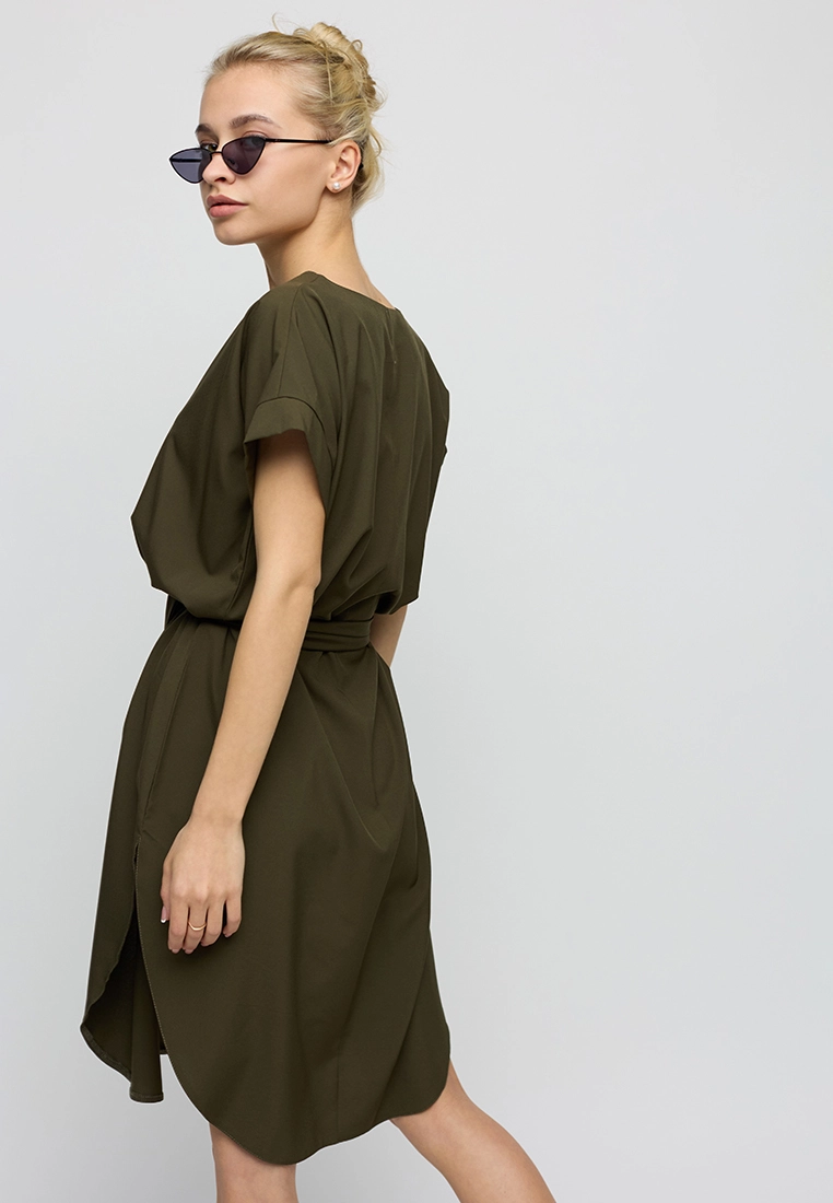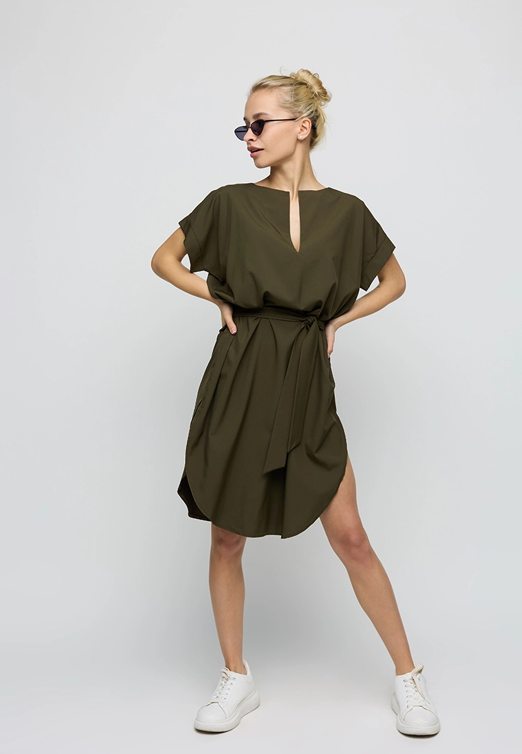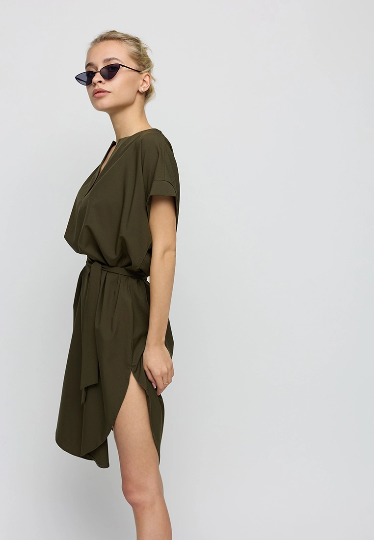 Платье свободного кроя из легкой летней ткани,на груди небольшой вырез-капелька, асимметричный низ, пояс в комплекте