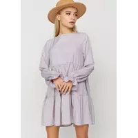 Платье мини из легкой ткани, отрезная линия талии, круглый вырез, спущенная линия плеча, рукав длинный с рюшей, фиксируется на запястьях с помощью резинок, по низу юбки рюша.