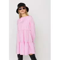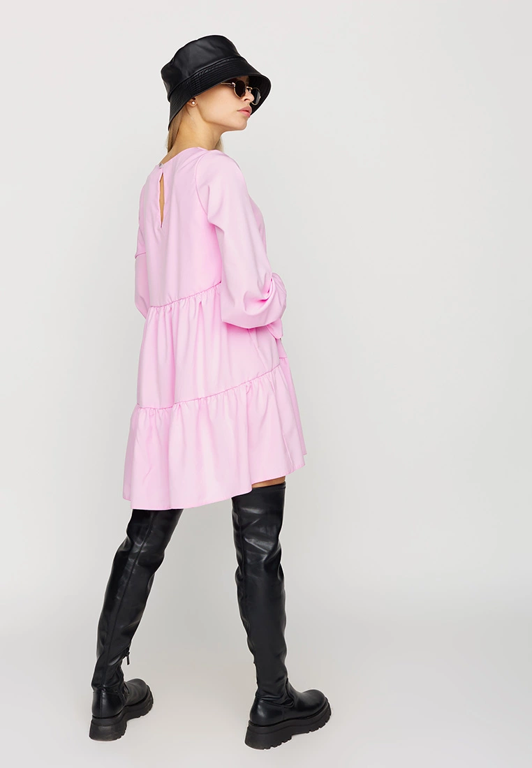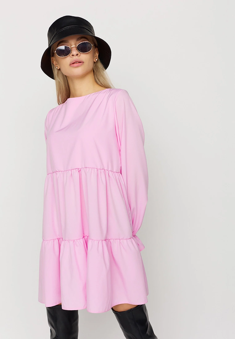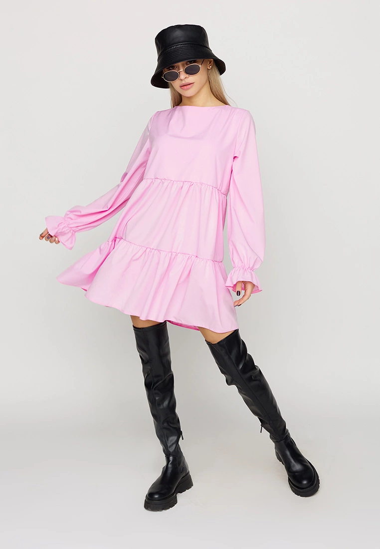 Платье мини из легкой ткани, отрезная линия талии, круглый вырез, спущенная линия плеча, рукав длинный с рюшей, фиксируется на запястьях с помощью резинок, по низу юбки рюша.