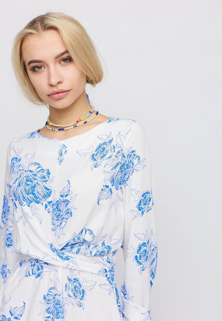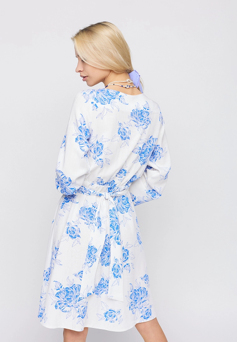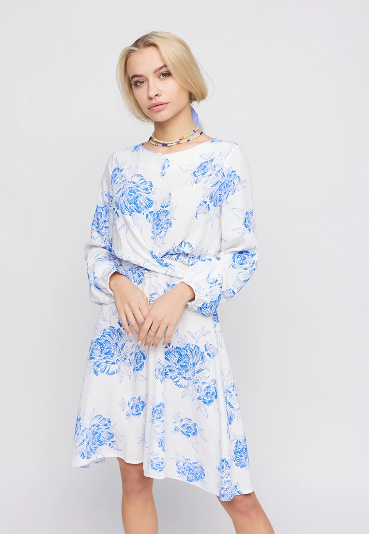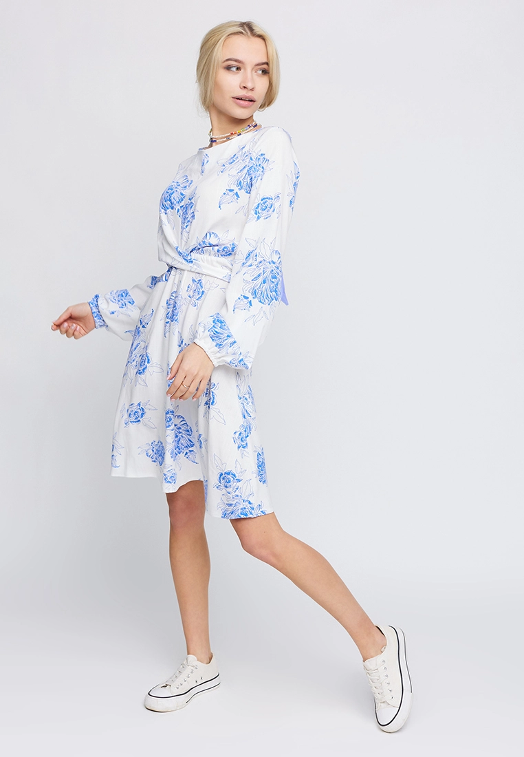 Платье длины мини из легкого штапеля, длинный широкий рукав собранный на резинку, по груди декоративная завязка, которая завязывается в бант