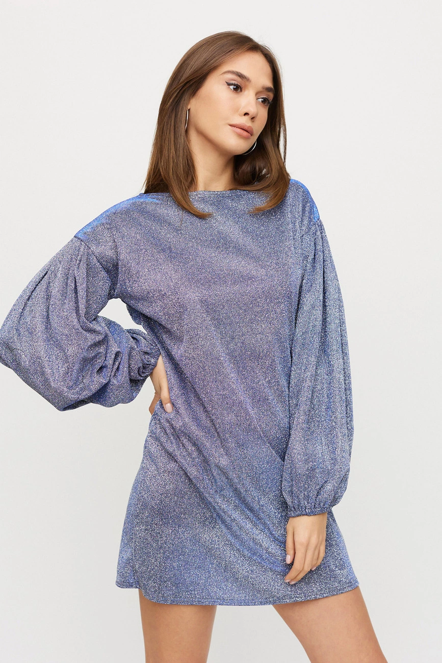 Платье мини из трикотажа с блестящим напылением, спущенная линия плеча, широкий рукав собран внизу на резинку