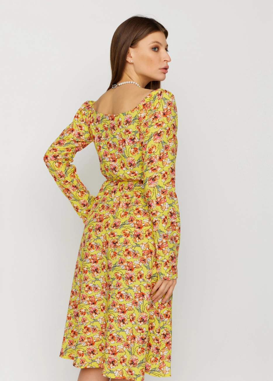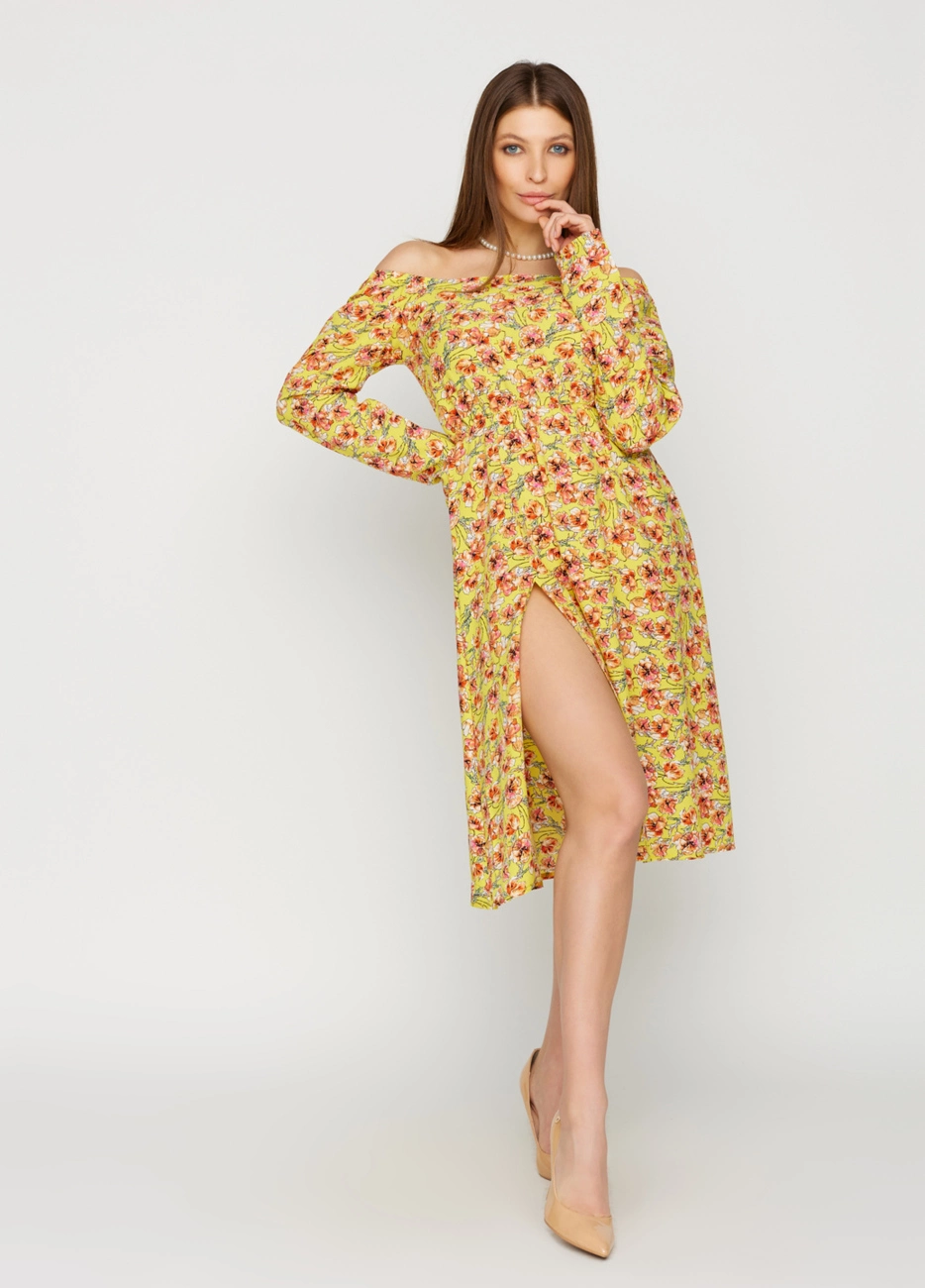 Платье длины миди из легкой принтованой ткани. Открытые плечи; вырез каре; по талии сборка на резинку; на правой ноге разрез.