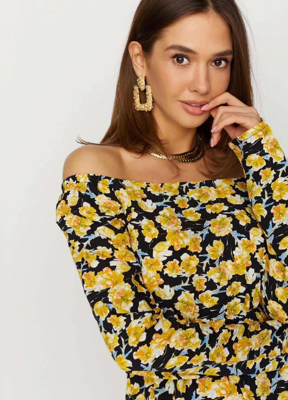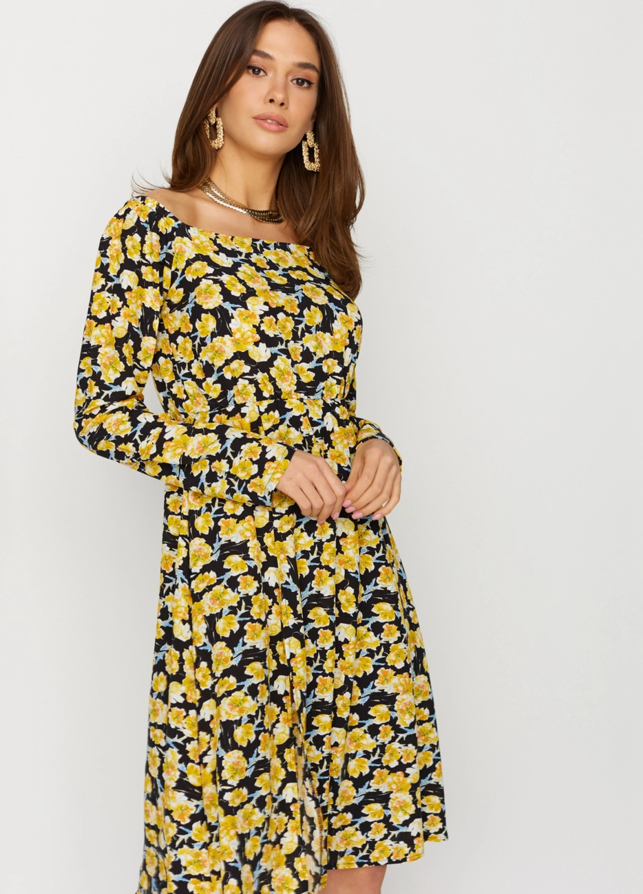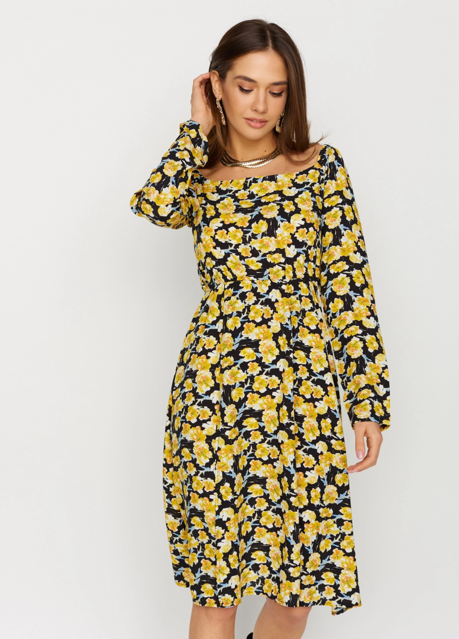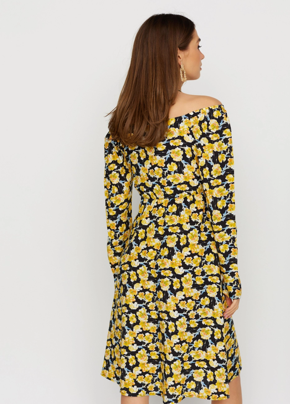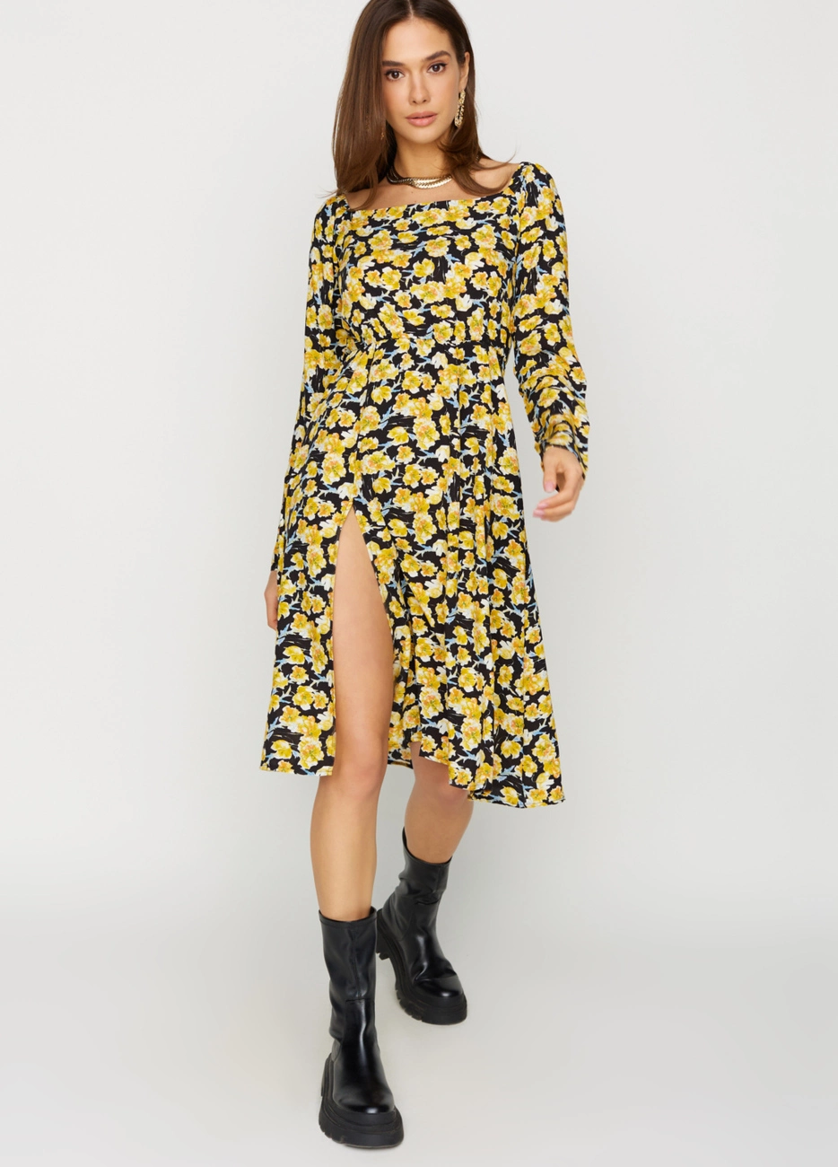 Платье длины миди из легкой принтованой ткани. Открытые плечи; вырез каре; по талии сборка на резинку; на правой ноге разрез.
