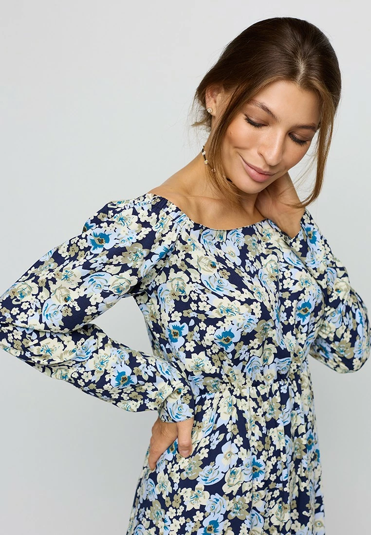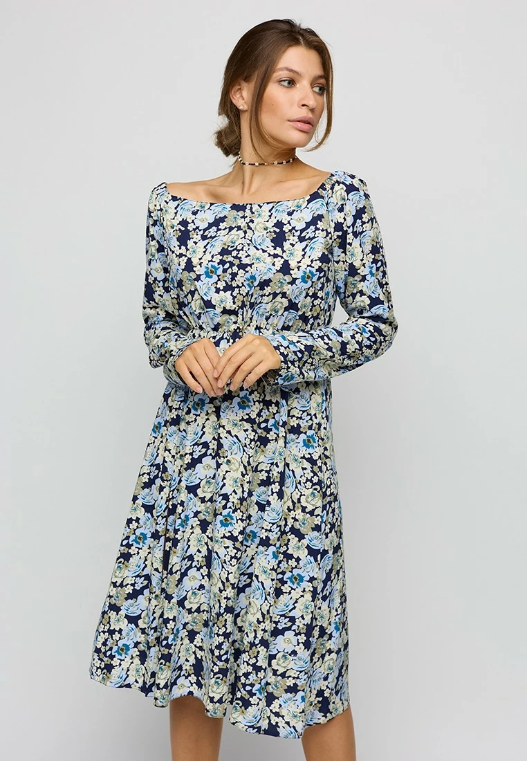 Платье длины миди из легкой принтованой ткани. Открытые плечи; вырез каре; по талии сборка на резинку; на правой ноге разрез.