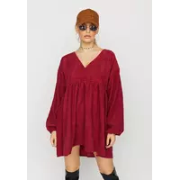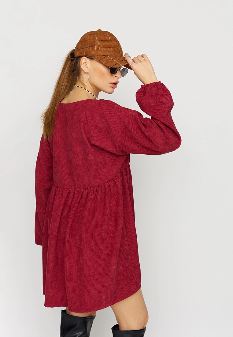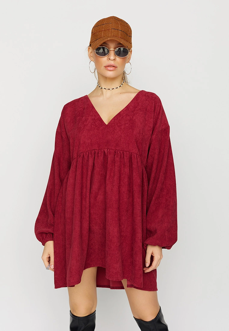 Платье мини из вельвета, отрезная линия талии,v-образный вырез, спущенная линия плеча, широкий рукав собран внизу на резинку