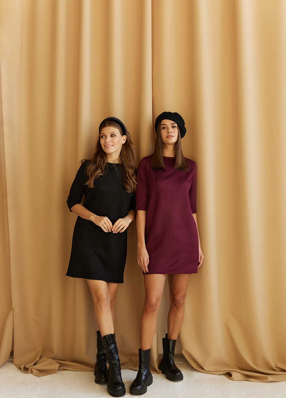 Платье трапецевидного кроя из плотного замша, рукав 3/4, на спинке неглубокий V-образный вырез декорированный лентами из черного креп-дайвинга
