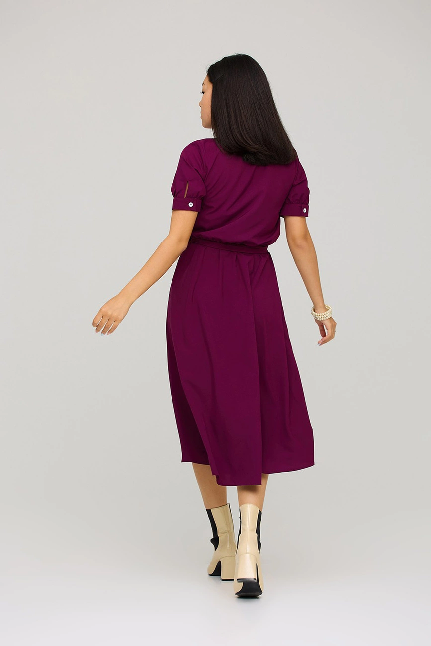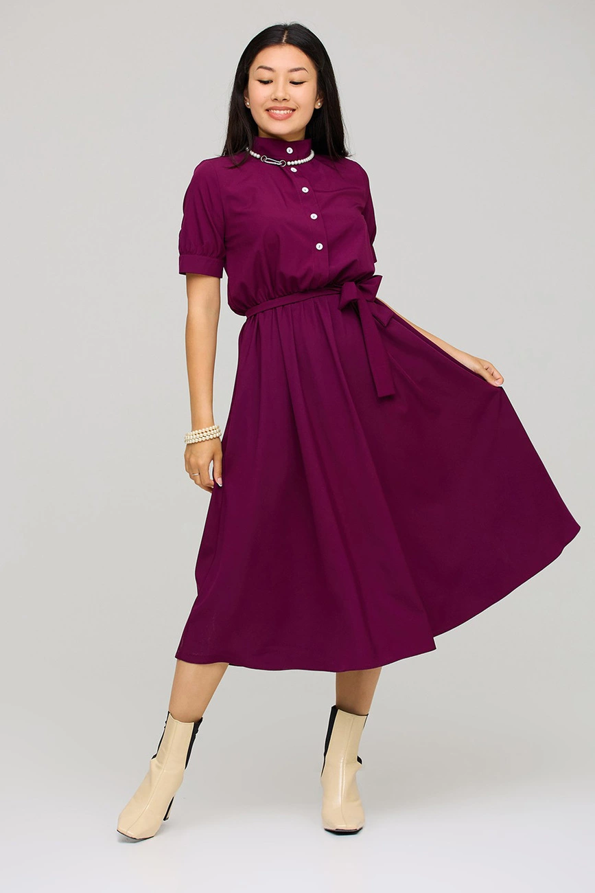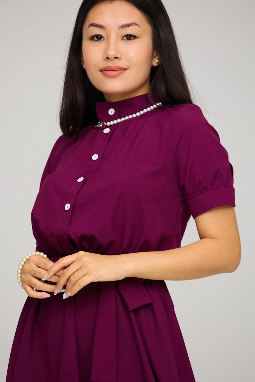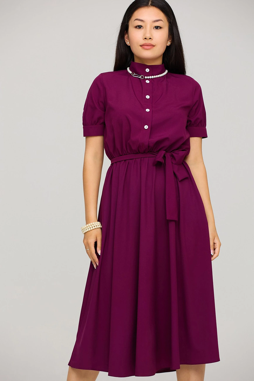 Платье приталенного кроя из приятной на ощупь ткани, воротник- стойка, рукав короткий с манжетами на пуговицах , отрезная линия талии, длина миди; застежка: пуговицы, пояс в комплекте; есть карманы